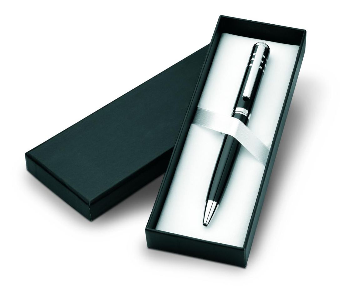 Bolígrafo metálico en acabado brillante. Se presenta en una caja de regalo de cartón. Tinta negra.