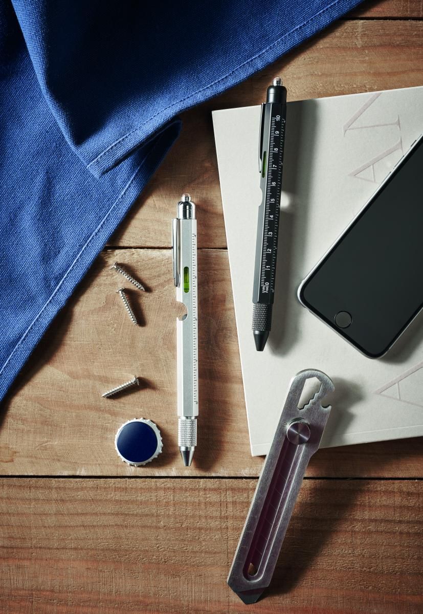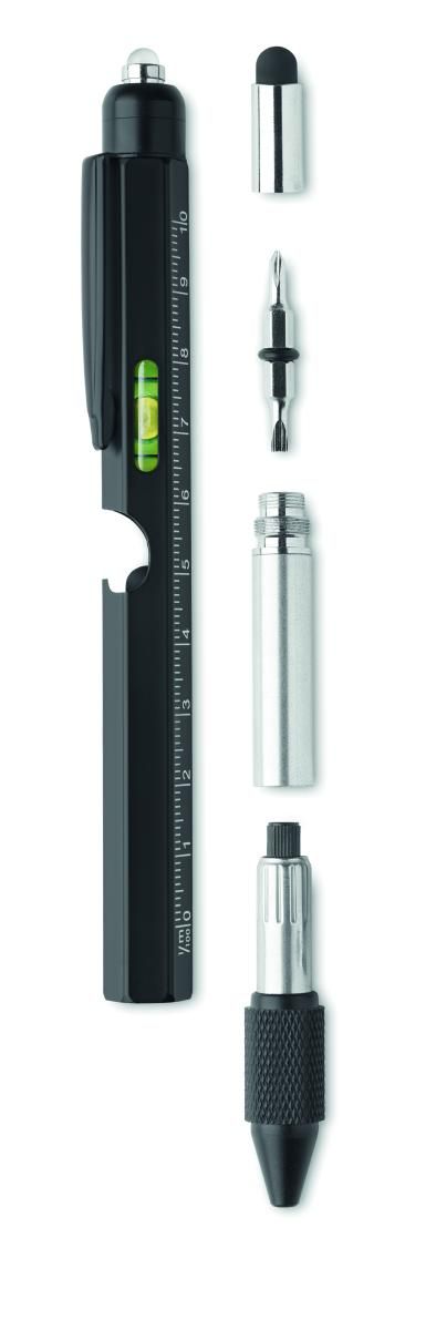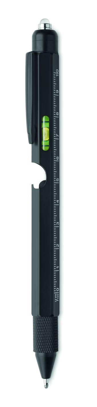 Bolígrafo giratorio de acero inoxidable con nivel de burbuja y regla 10 cm, puntero táctil y puntas de destornillador de cabeza Phillips y plana y LED. 3 pilas AG incluidas. Tinta azul.