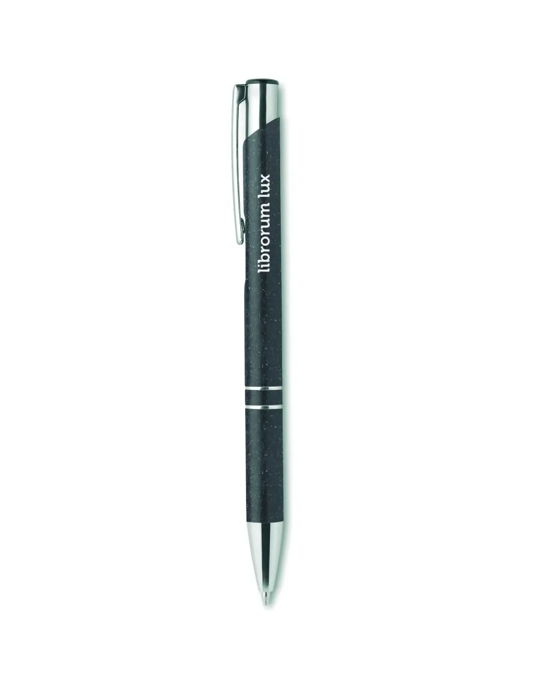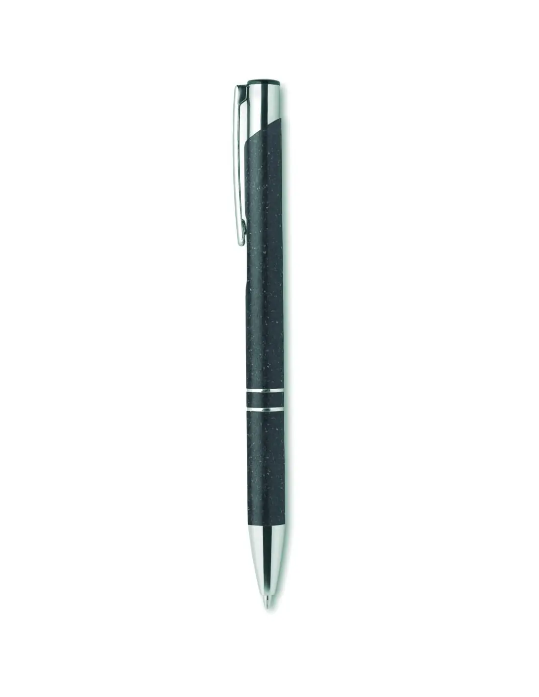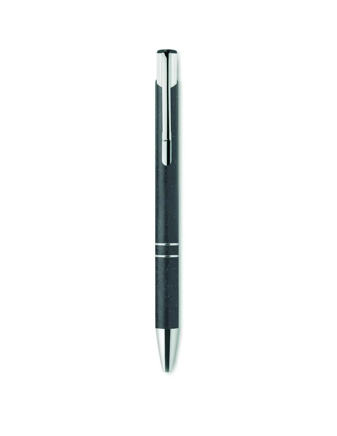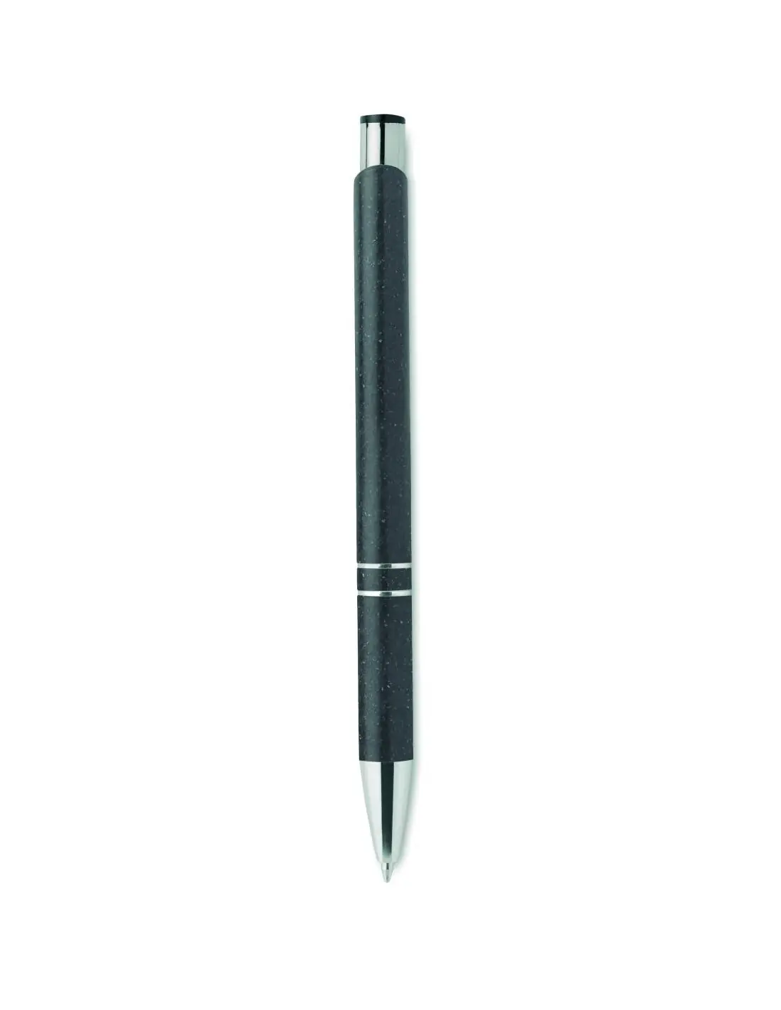 Boligrafo pulsador de paja de trigo (50%) y de ABS (50%) con acabados plateados. Tinta azul.