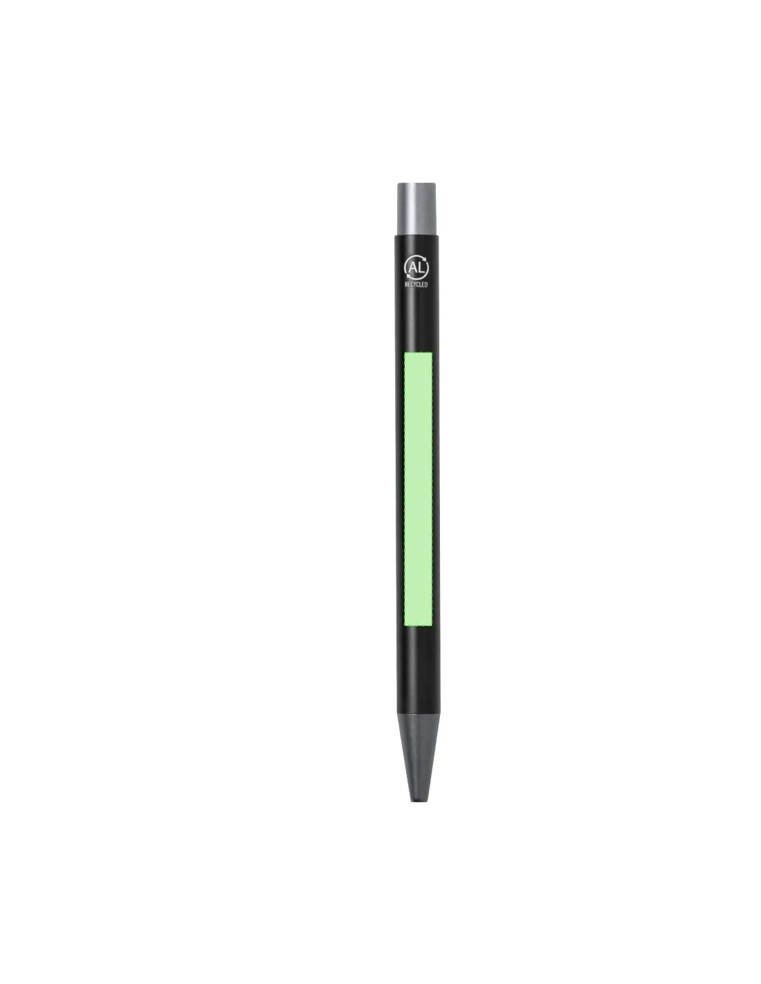 Bolígrafo eco-friendly fabricado en aluminio reciclado, cuyo origen se encuentra en la reutilización casi infinita de uno de los materiales con mayor potencial de reciclabilidad sin perder sus propiedades. Esta característica lo convierte en un material eco-friendly de origen reciclado, fácilmente reciclable y de cuyos procesos de tratamiento y desechos para la obtención del material se pueden obtener nuevos recursos reutilizables, consumiendo menos energía en su fabricación, entre otros factores de sostenibilidad. De mecanismo pulsador, con cuerpo disponible en variada gama de colores metalizados y accesorios en acabado gun. Clip metálico, tinta azul y distintivo aluminio reciclado en la parte superior del bolígrafo. Certificación GRS (Global Recycled Standard / Estándar de Reciclaje Global), que garantiza el origen reciclado del material usado para fabricar el producto.