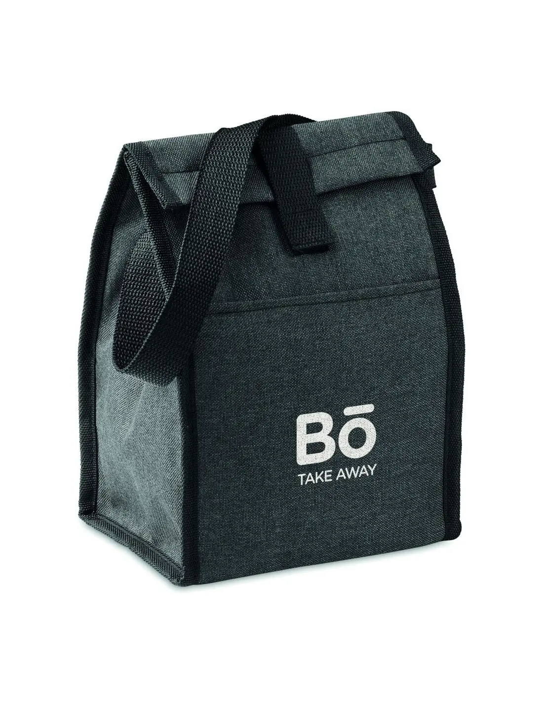Bolsa aislante para alimentos en RPET 600D con bolsillo frontal. Capacidad de 3L. Material aislante: espuma de PE de 2 mm con recubrimiento de aluminio.