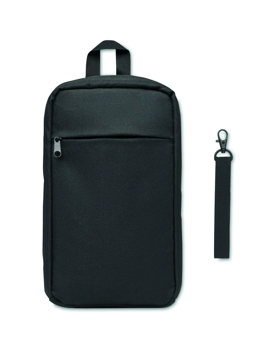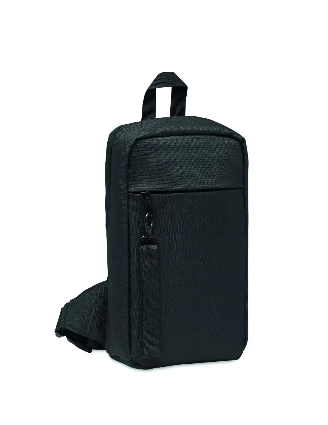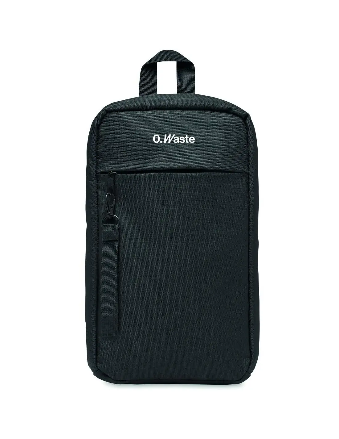 Bolsa cruzada en poliéster RPET 600D. Compartimento principal acolchado con bolsillo de malla RPET y bolsillo frontal con cremallera. Correa ajustable y asa independiente.