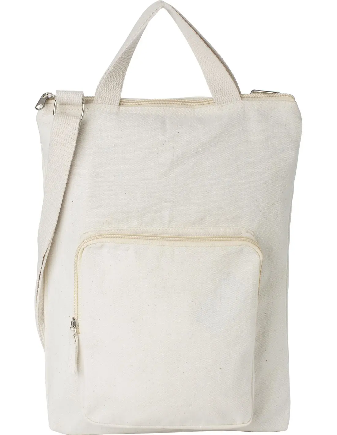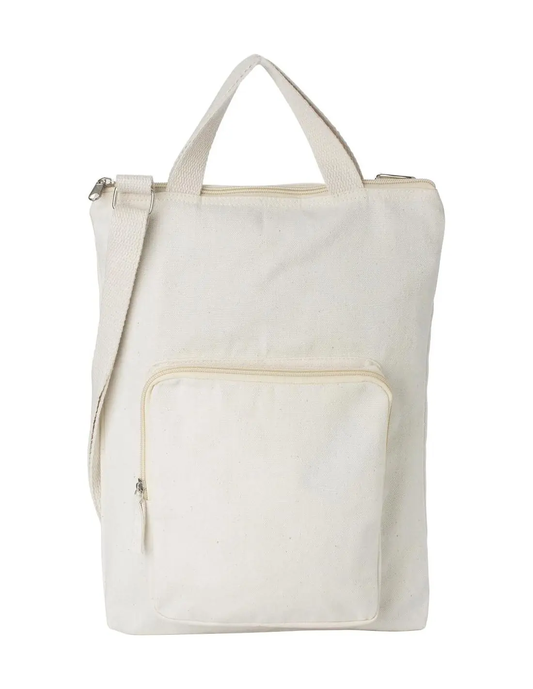 Bolsa de algodón (340 g/m2). Tiene un compartimento grande con cremallera y un bolsillo frontal con cremallera. Dos asas cortas y una bandolera ajustable.