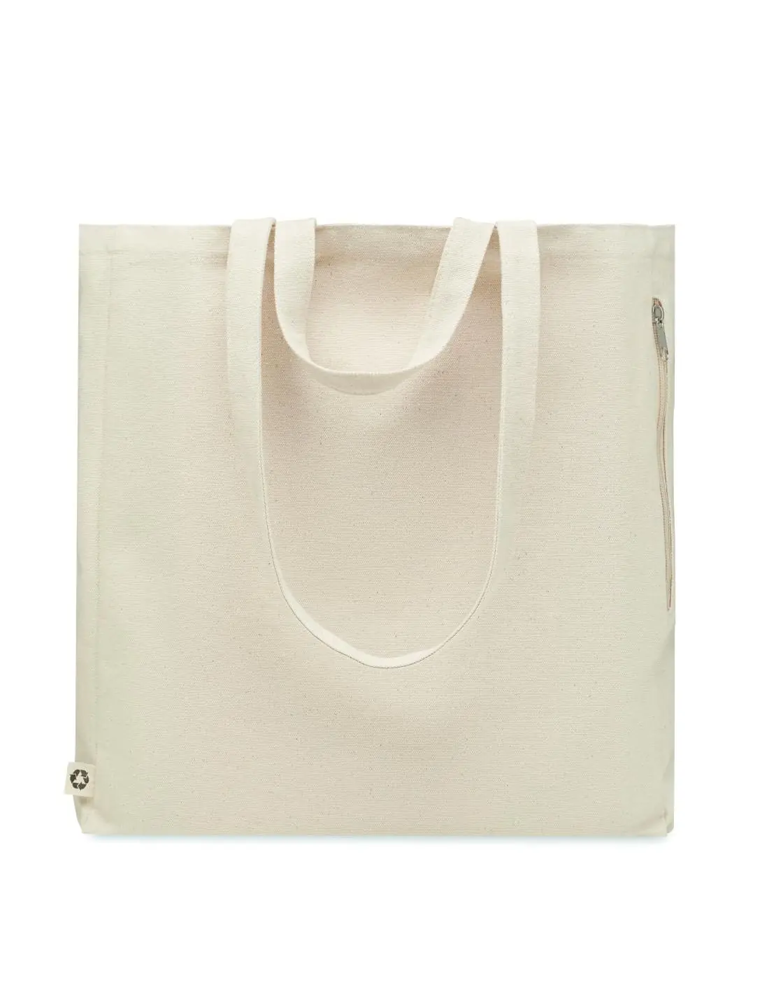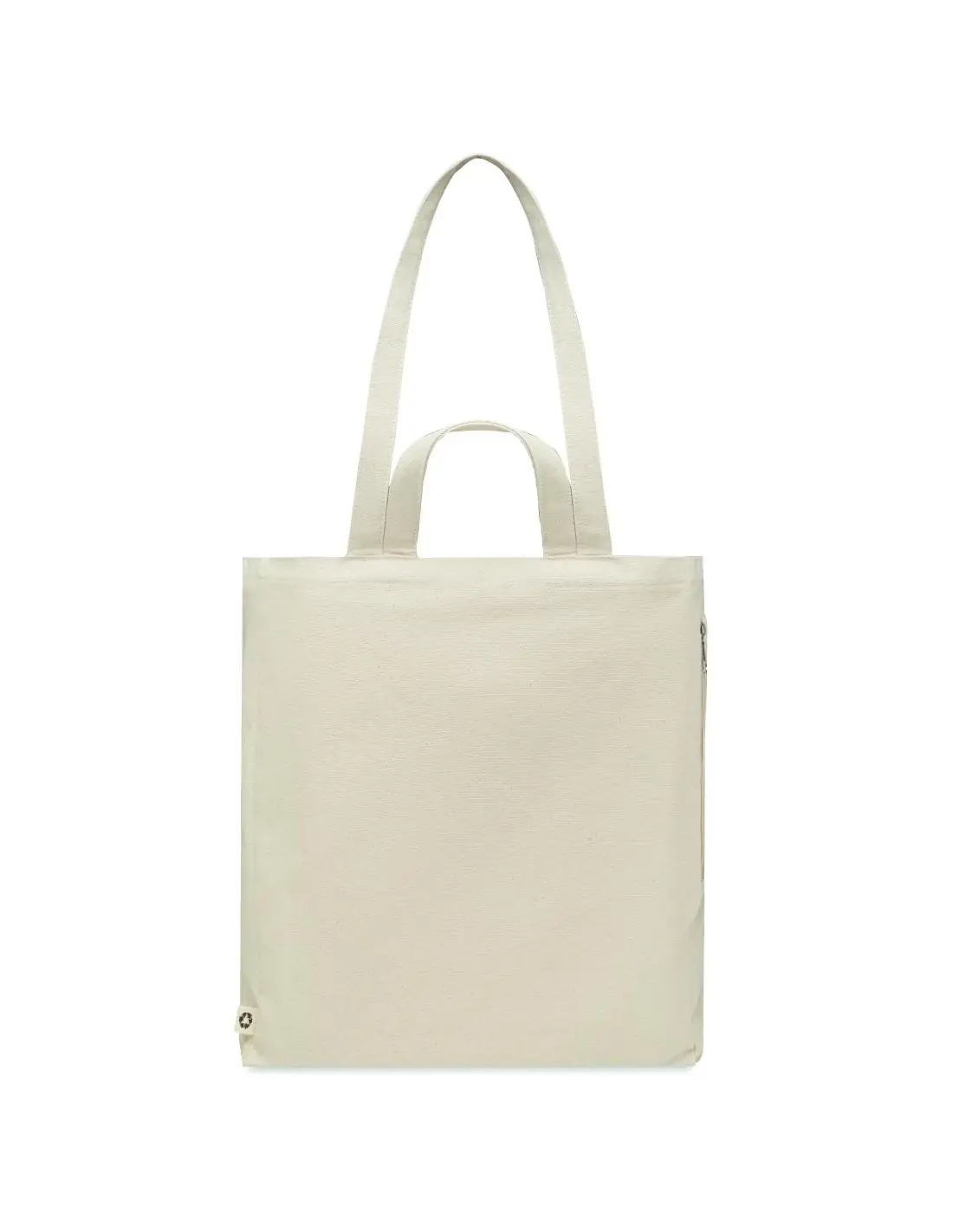 Bolsa de la compra o de playa de poli algodón reciclado (70% algodón reciclado, 30% poliéster reciclado) con asas cortas y largas. Dispone de un bolsillo lateral con cremallera. 380 gr/m².