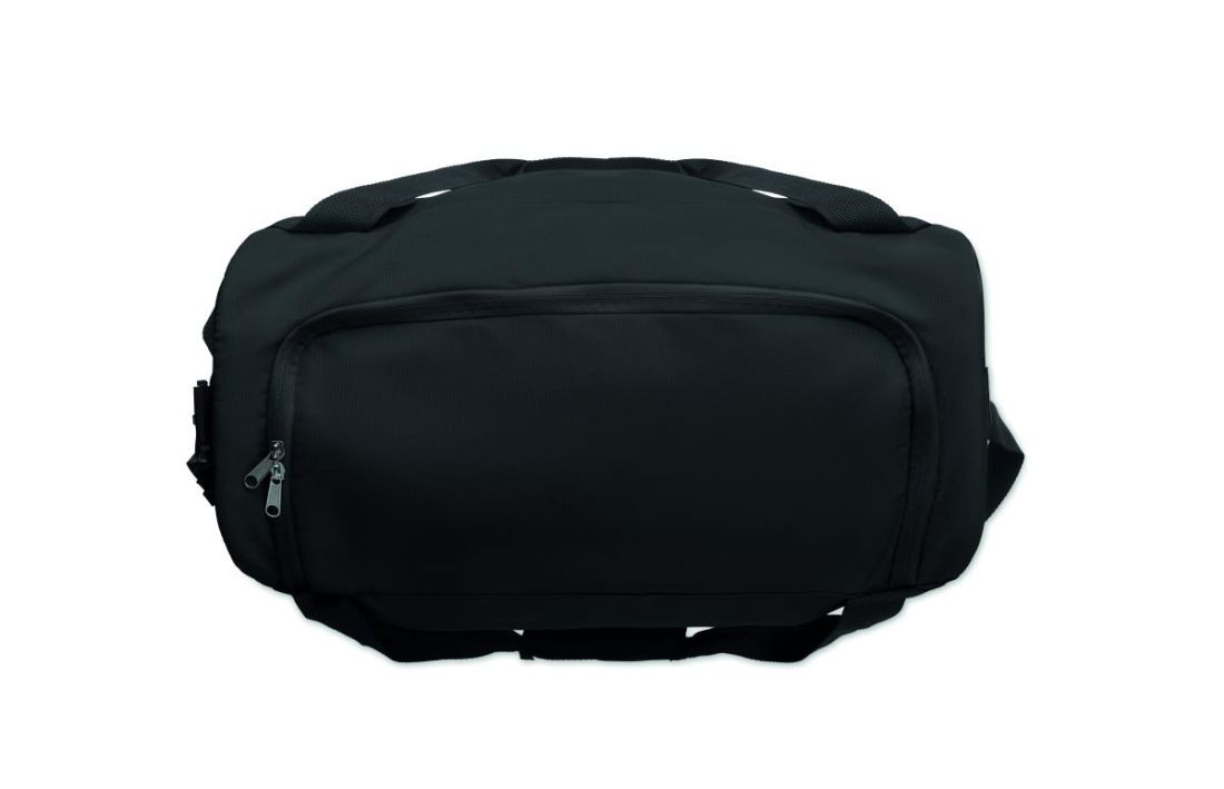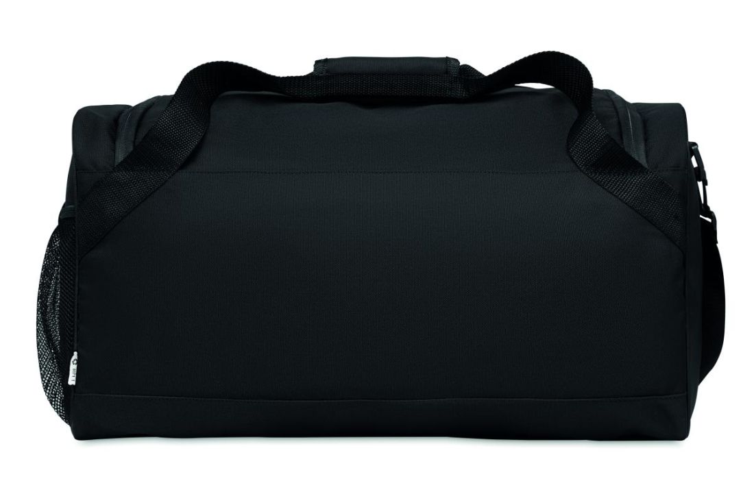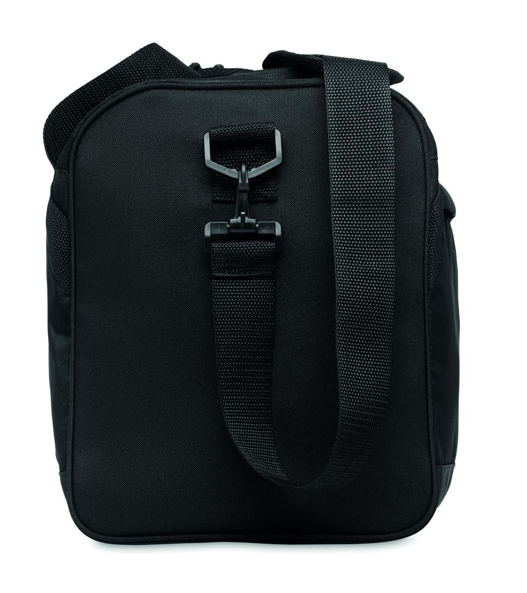 Bolsa de deporte o viaje de RPET 600D con bolsillo frontal e interior con cremallera y con cinta bandolera ajustable y desmontable.