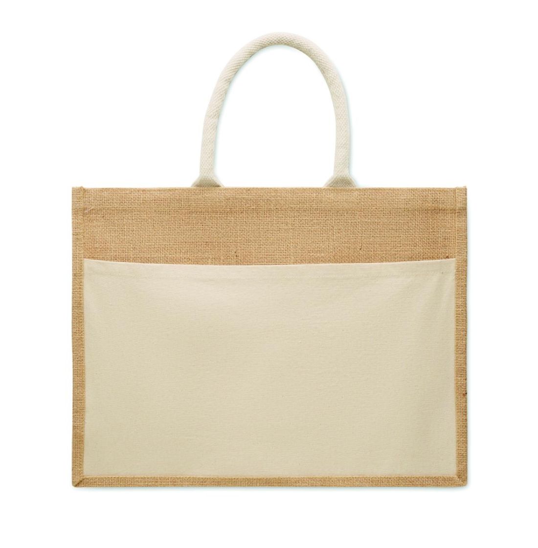 Bolsa de la compra de yute laminado y lona de algodón de 280 gr/m² con asas de cordón. Incluye gran bolsillo frontal abierto.