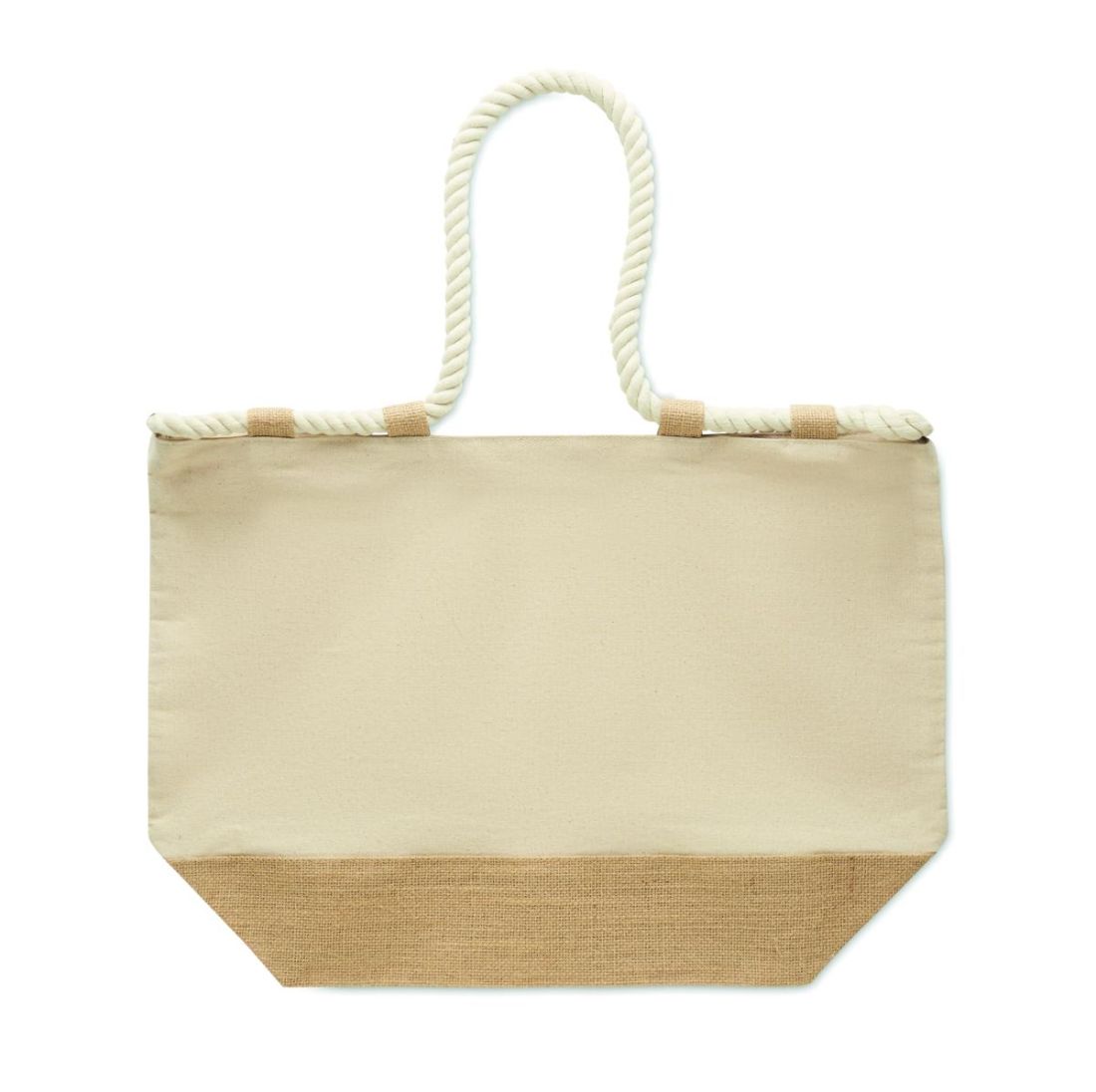 Bolsa de playa de lona de algodón de 280 gr/m² y yute con asas de cuerda. Con cierre de cremallera, base recubierta de yute y 10 trabillas de yute.
