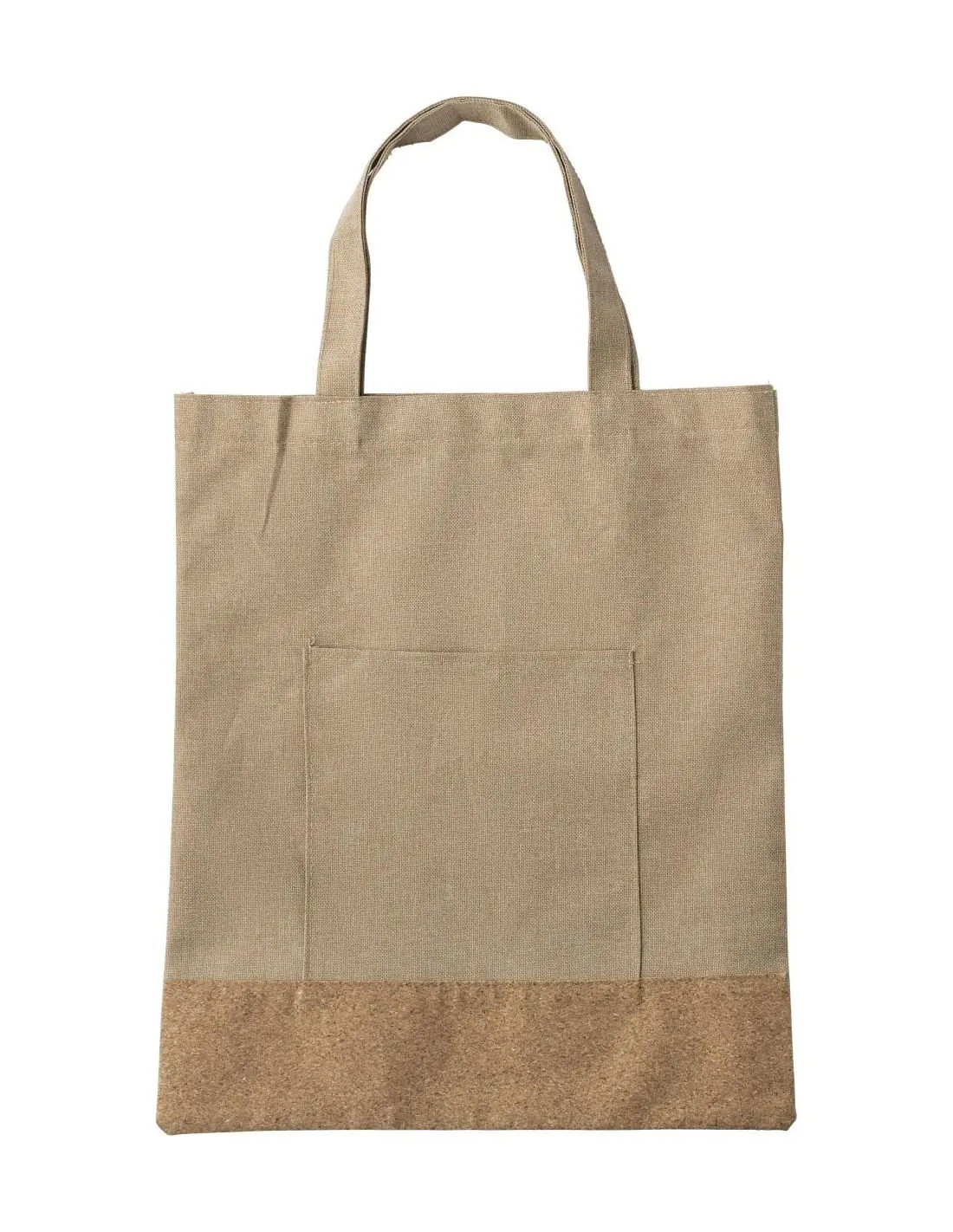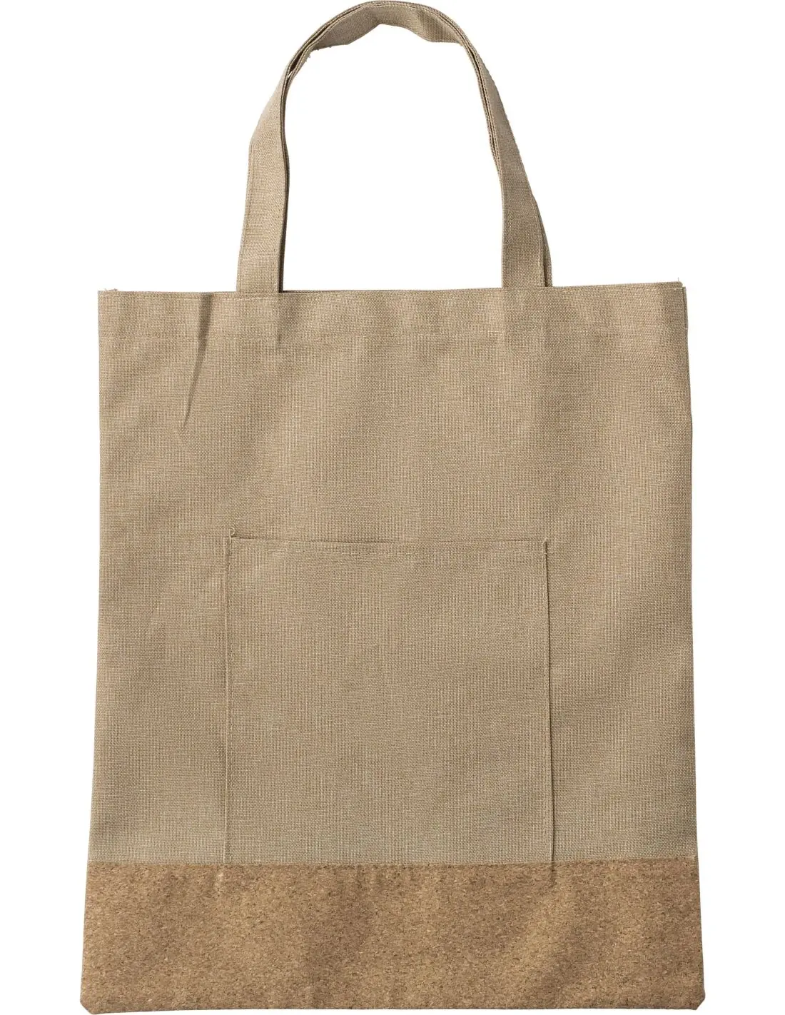 Bolsa de poliéster rPET (600D) y de corcho. Con un pequeño bolsillo en la parte delantera, asas cortas y etiqueta rPET.