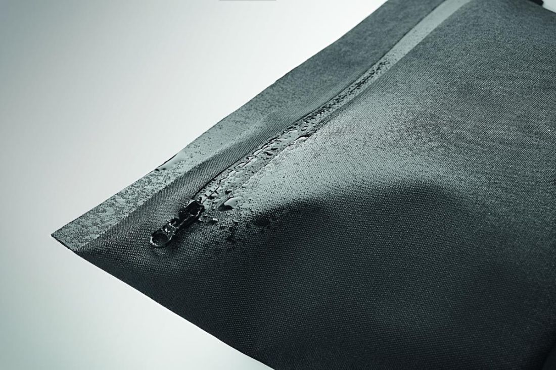 Bolsa para objetos personales o documentos en RPET 300D y revestimiento de PVC con correa. Tejido resistente al agua.
