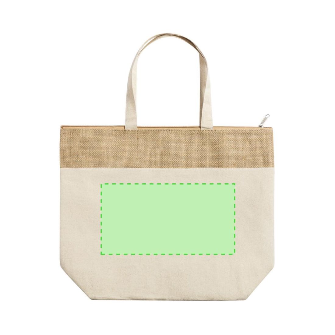 Bolsa térmica en resistente material 100% algodón de 225g/m2, con parte superior en yute laminado y asas de algodón. Compartimento principal con cierre de cremallera y tirador metálico, con interior isotermo de aluminio. De acabado cosido, con asas medianas reforzadas y resistencia hasta 7kg de peso.