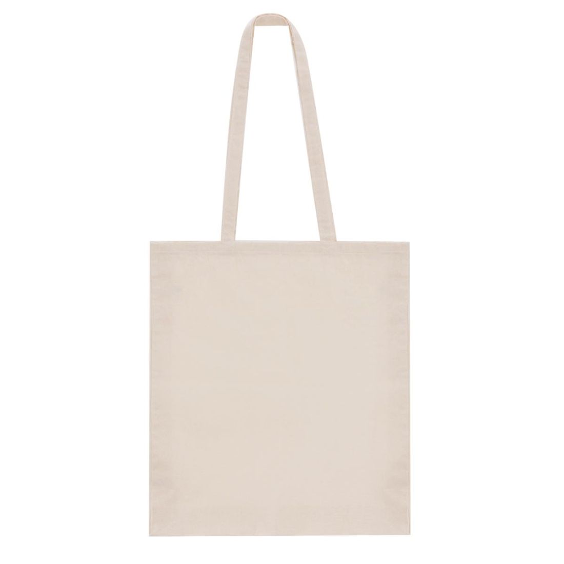 Bolsa fabricada en algodón 100%, de acabado natural y en 140g/m2. De acabado cosido, con fuelle en base y asas largas reforzadas (70 x 2,5 cm). Resistencia hasta 6 kg de peso.