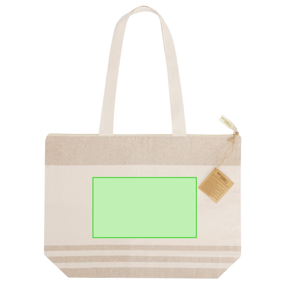 Bolsa confeccionada principalmente en algodón reciclado de 300 g/m2 en elegante tono natural con diseño a rayas horizontales en color. Con fuelle en base y laterales. Asas largas de 70cm con refuerzo, de acabado cosido. Logotipo en etiqueta en cremallera.