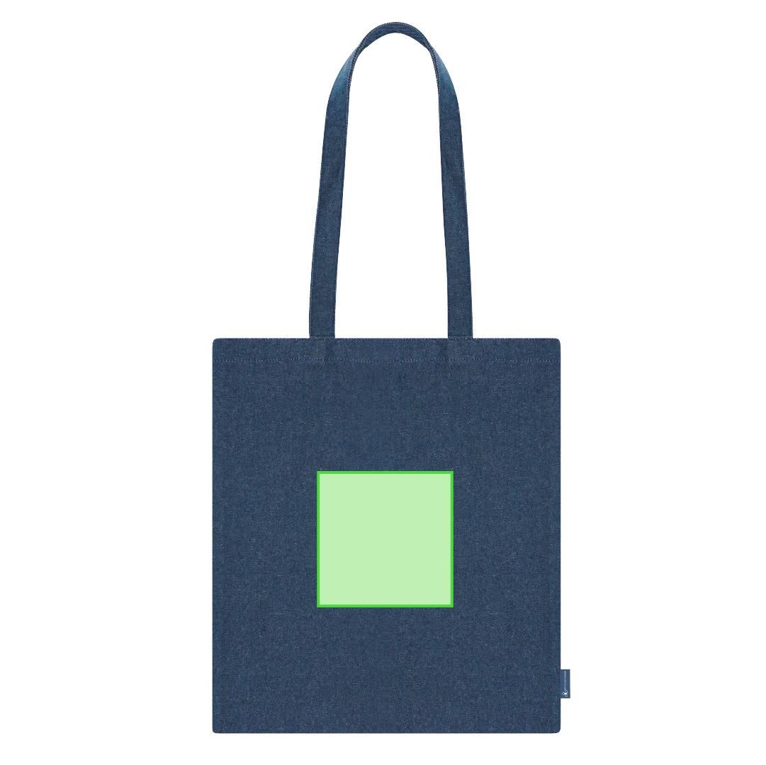 Bolsa confeccionada en tejido vaquero reciclado de 300 g/m2. Asas largas de 70cm con refuerzo, de acabado cosido. Logotipo de Denim Reciclado en etiqueta lateral y resistencia hasta 8 kg de peso.
