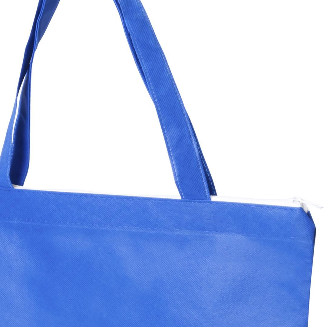 Bolsa de non-woven de 90g/m2 en variada gama de vivos colores. Con cierre de cremallera en color blanco, fuelle, asas medianas de 45cm y acabado cosido. Resistencia hasta 6kg de peso.