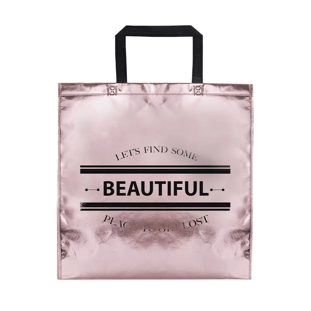 Bolsa en non-woven laminado de acabado metalizado. Disponible en colores dorado, plateado y oro rosa. Con asas medianas reforzadas de 42 cm de largo. De acabado termosellado, con fuelles y ribetes reforzados. Resistencia hasta 7kg de peso.