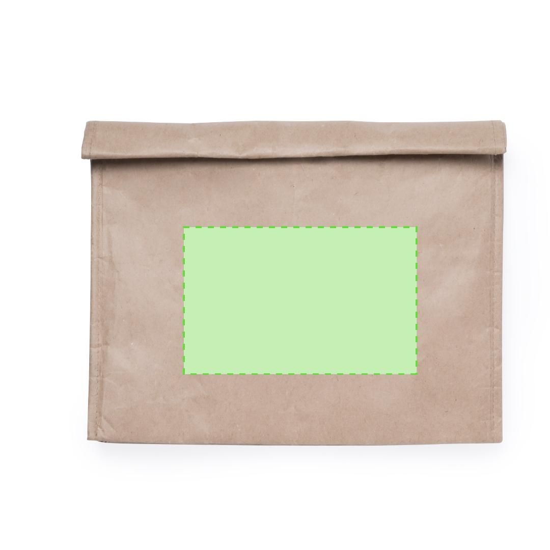 Bolsa térmica en papel resistente a la humedad de 85g/m2. Con interior isotermo acabado en aluminio, y cierre de velcro. 2,6 litros de capacidad.