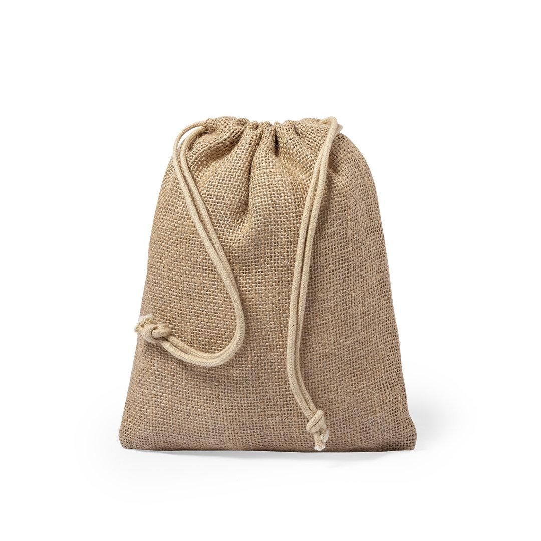 Bolsa de línea nature en resistente yute de 260gsm, con elegante cierre de cordón y acabado cosido.