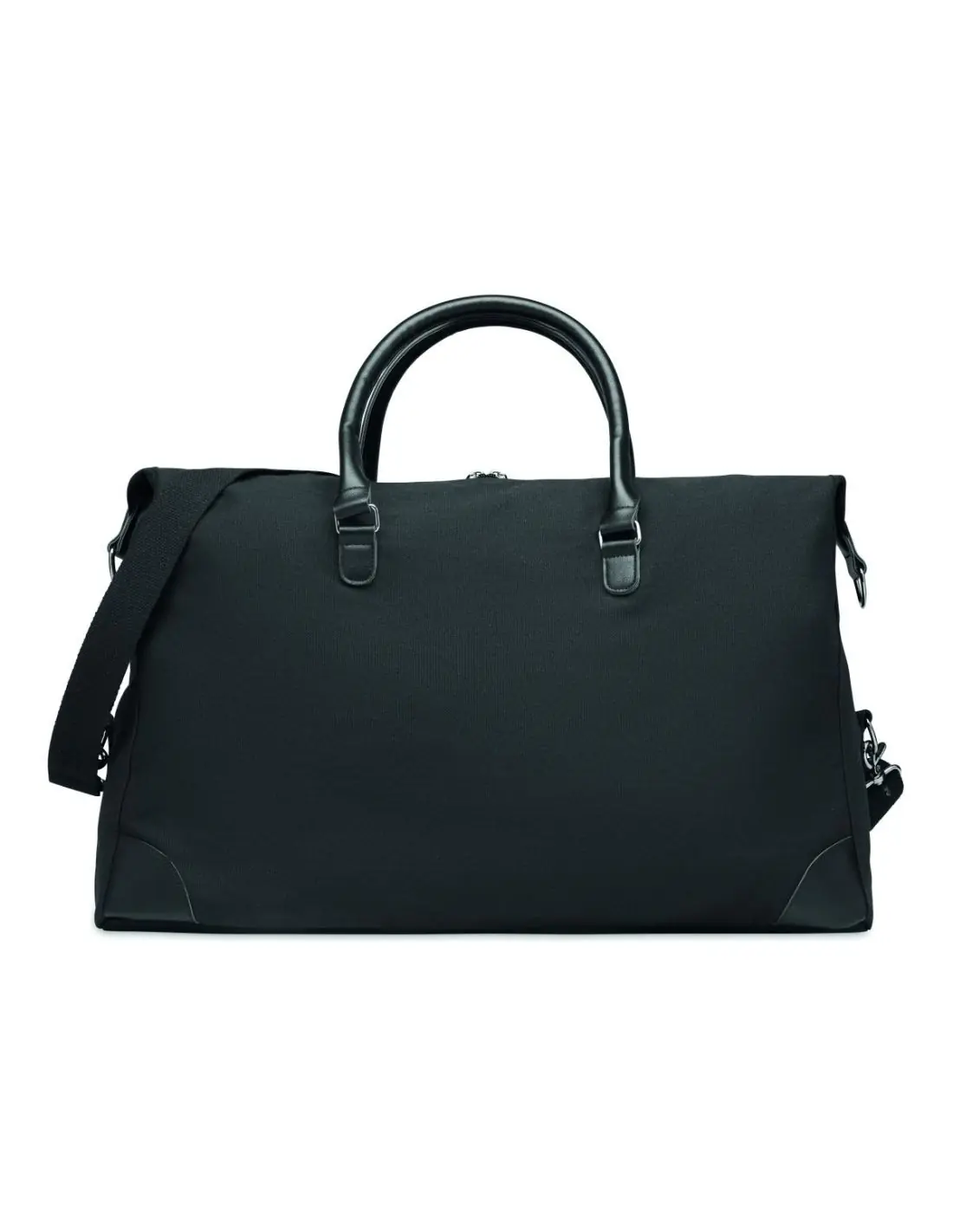 Bolsa de fin de semana en canvas de 340 gr/m² con detalles en PU reciclado. El forro es de RPET 210D. Incluye correas resistentes, ajustables y desmontables. Tamaño perfecto para el equipaje de mano.