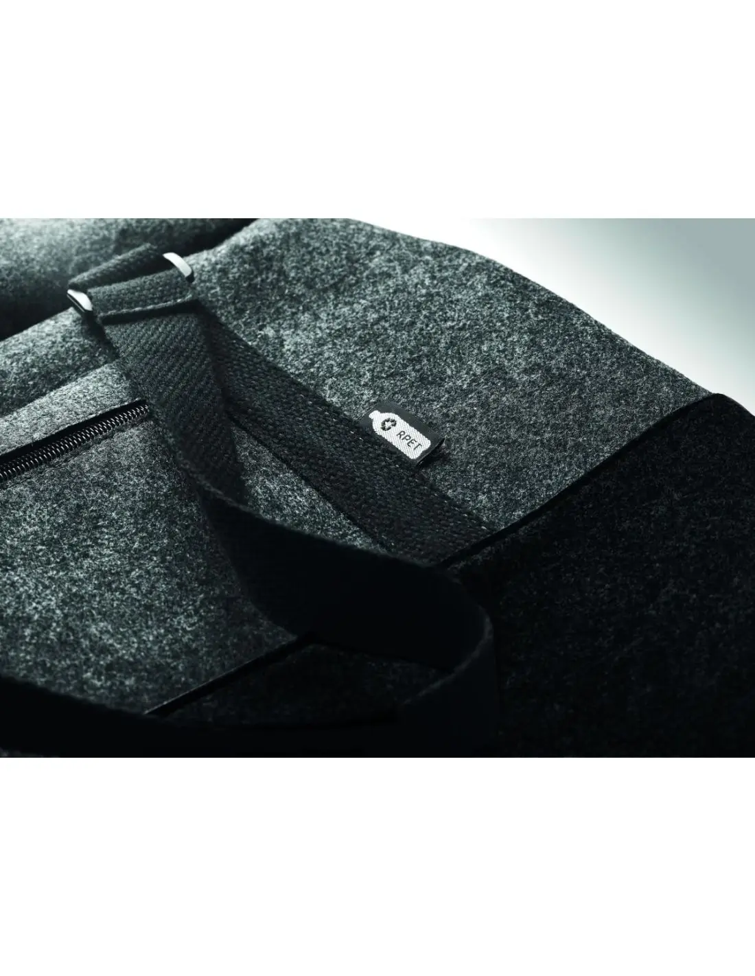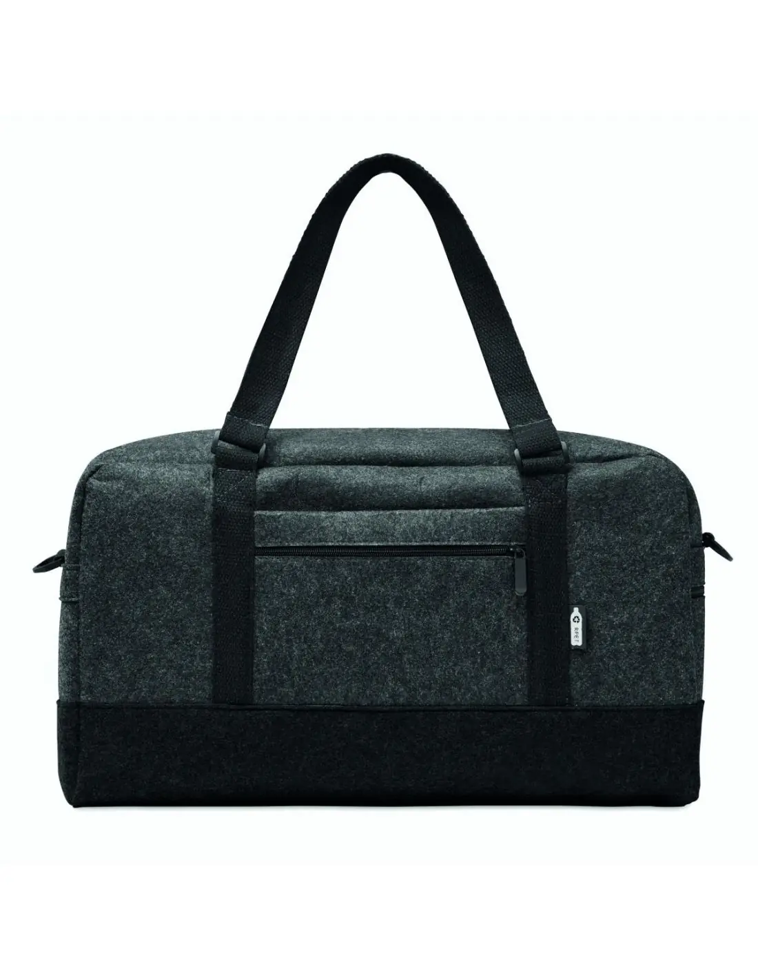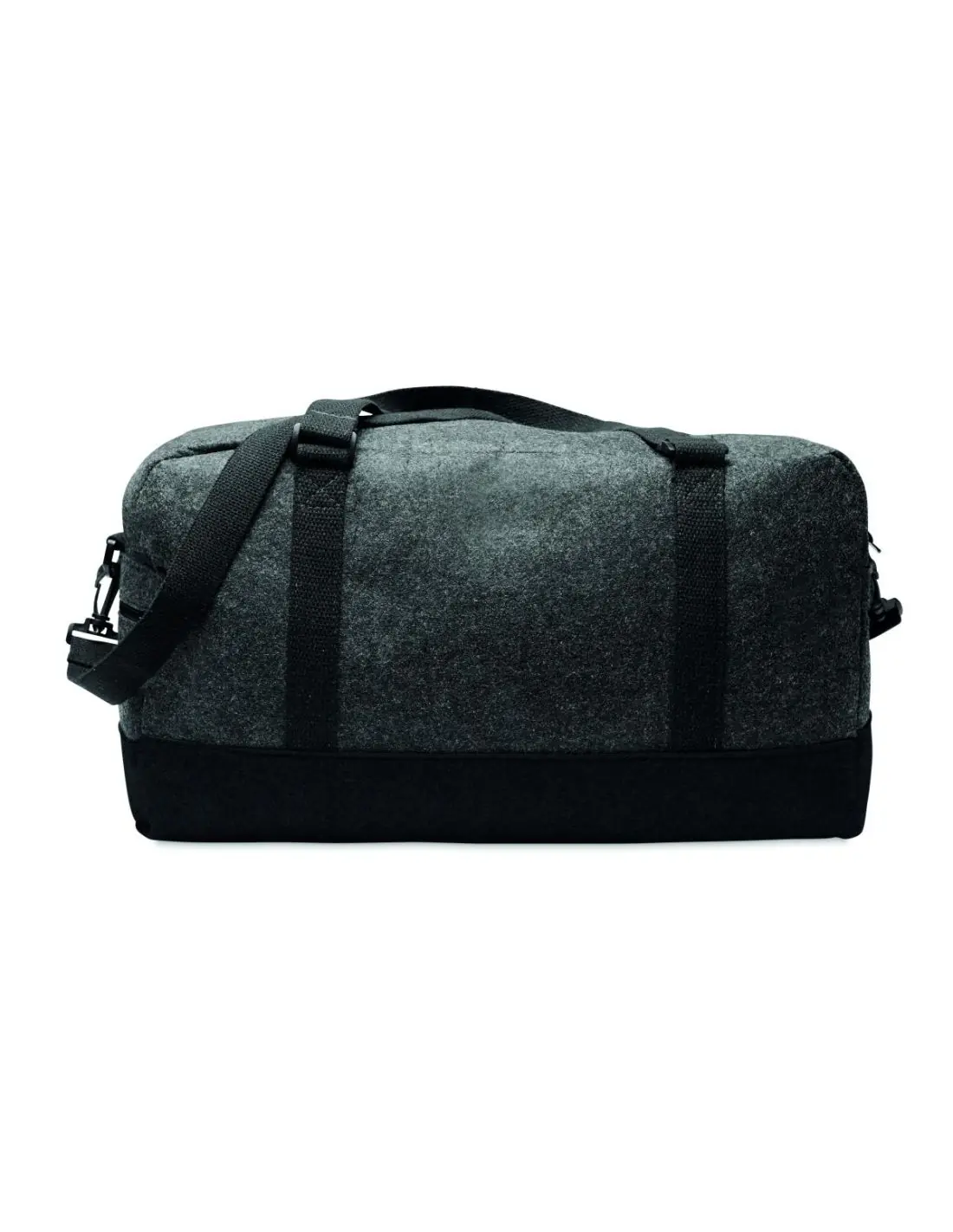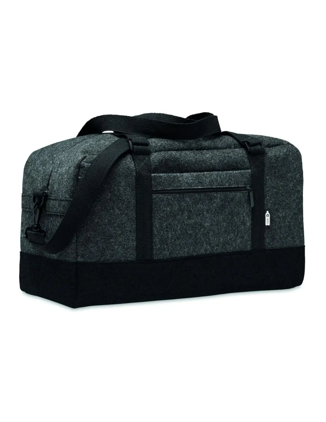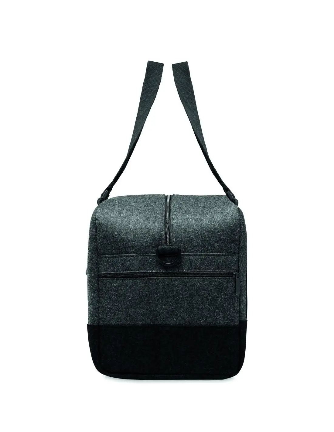 Bolsa de deporte o fin de semana de fieltro de RPET. Con bolsillo frontal con cremallera, asas de canvas y bandolera ajustable desmontable.