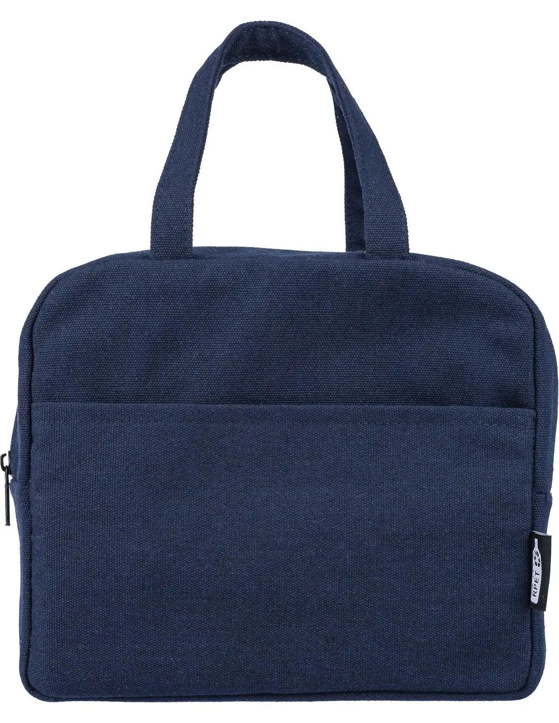 Bolsa isotérmica de polialgodón reciclado (330 g/m2) con un forro de poliéster 210D e interior acolchado de papel de aluminio. Tiene una capacidad de 8L, un asa de transporte, detalles a juego y una capacidad de carga de 5 kg. Incluye una etiqueta indicando que es material reciclado. Puede usarse también como neceser de viaje para mantener bien los cosméticos.