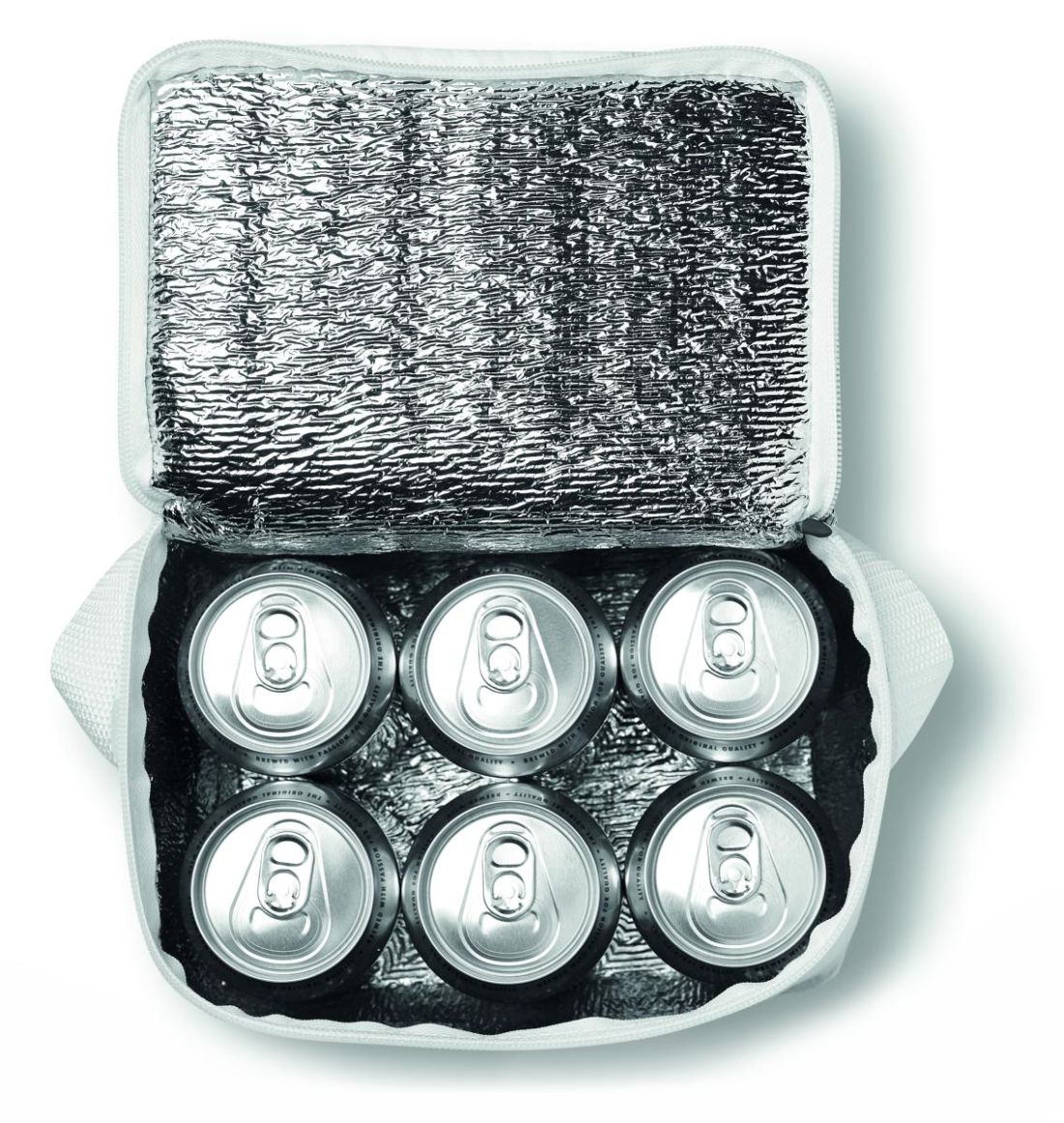 Bolsa nevera con interior de aluminio para 6 latas de 330 ml. Exterior de poliéster 210D, los ribetes son de material non woven. Material de aislamiento: Espuma con laminado de papel de aluminio. Capacidad 3L.