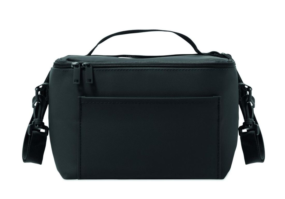 Bolsa nevera de PU con forro de poliéster RPET de 100 g. Incluye 1 bolsillo frontal, asa y correa para el hombro. Espuma aislante de PE con forro de PEVA. Capacidad 5,5L.