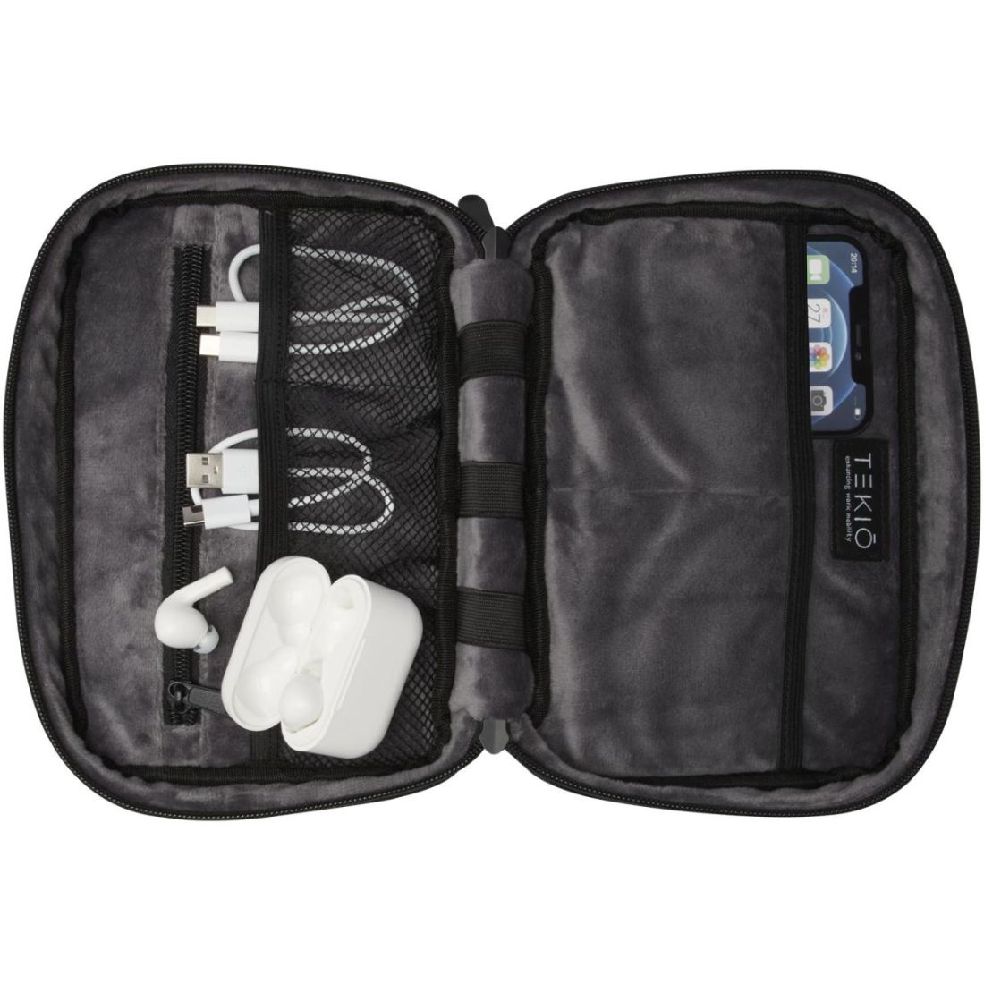 La bolsa organizadora es una solución polivalente para organizar todos tus dispositivos tecnológicos. Fabricada en poliéster reciclado GRS 900D y forro de felpa reciclada GRS, esta bolsa rígida cuenta con dos bolsillos en los laterales, bolsillos de malla, correas elásticas en la parte inferior para cables y un bolsillo con cremallera para accesorios adicionales. Todos los bolsillos garantizan una organización óptima y la carcasa rígida protege todos los dispositivos de valor.