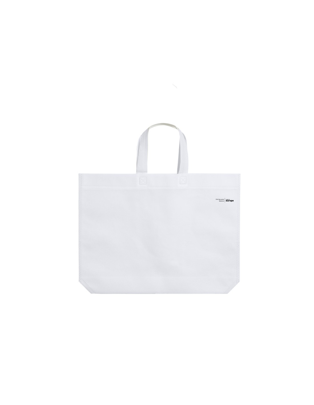 Bolsa de línea nature, fabricada en non-woven reciclado de 70g/m2. De fabricación europea, con acabado termosellado, con fuelle, asas largas y distintivo eco/made in sobre la bolsa.