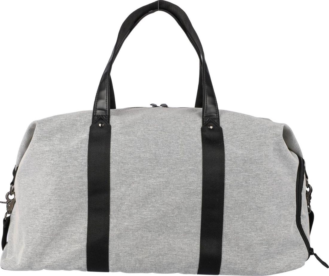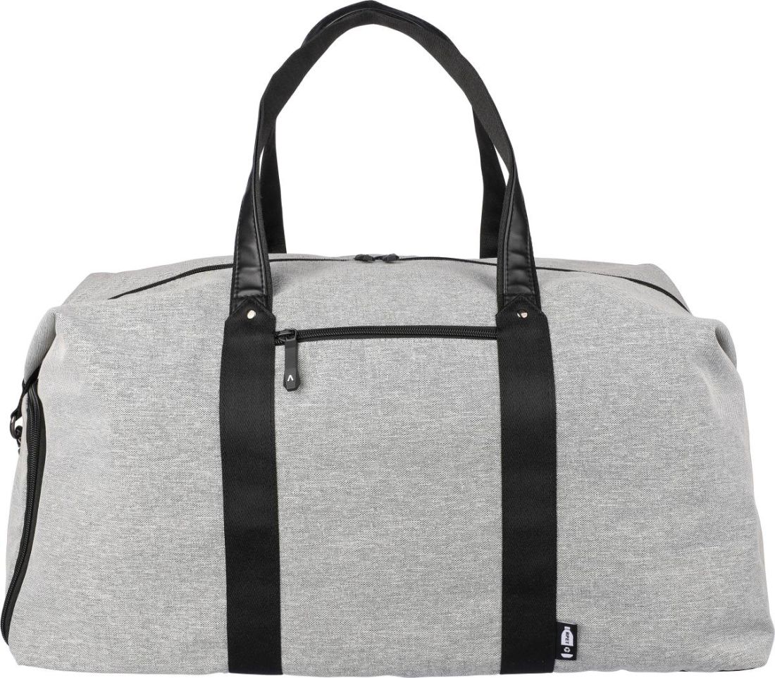 Bolsa de lona de poliéster reciclado 600D con forro de PU 150D y detalles de cuero PU. Con espuma de 4 mm en el interior y un tablero de PE de 1 mm. Incluye un pequeño compartimento con cremallera en la parte delantera, un compartimento grande con cremallera y un bolsillo para zapatos en el lateral. Correa de hombro ajustable y dos grandes asas. Incluye etiqueta rPET en la parte delantera.