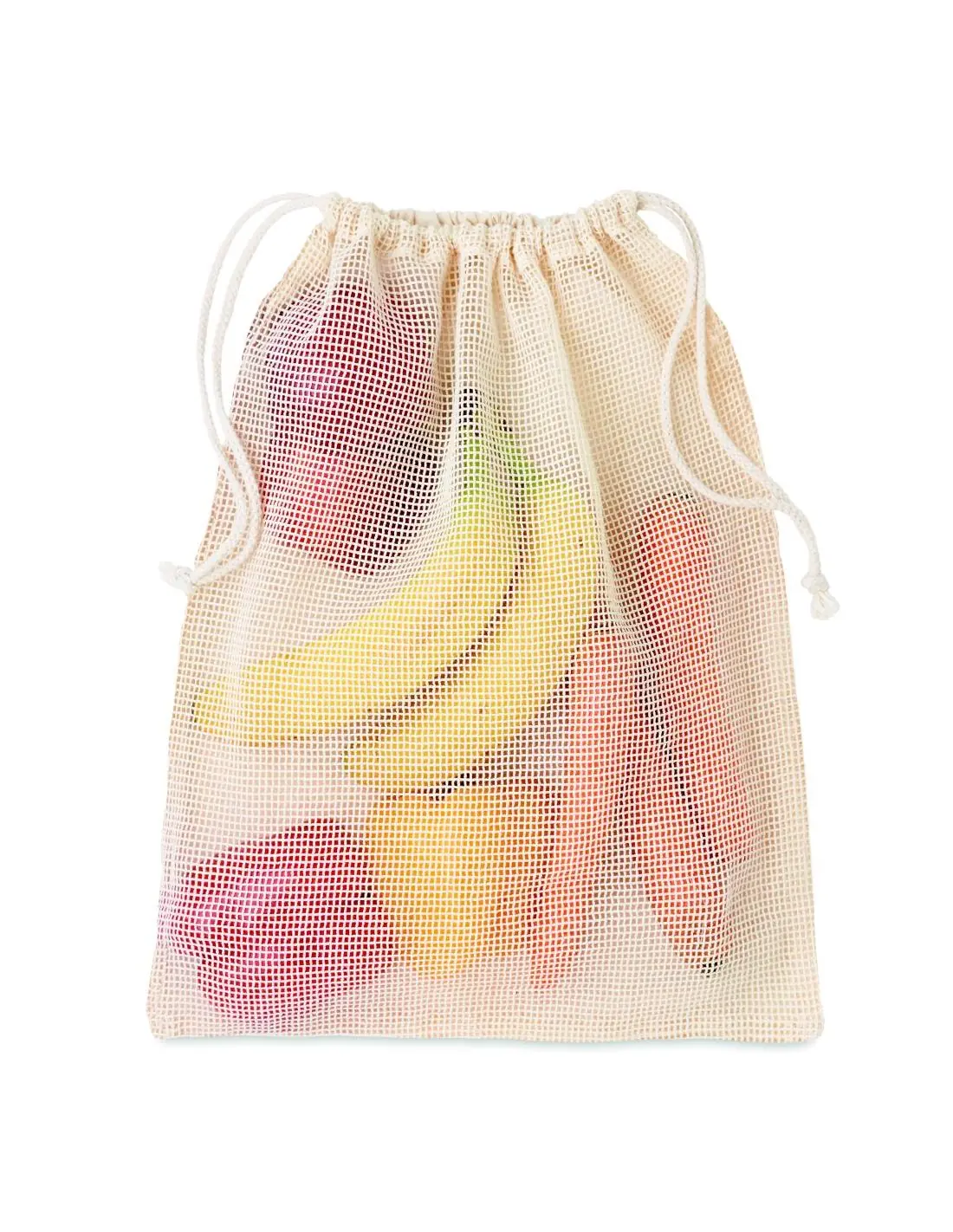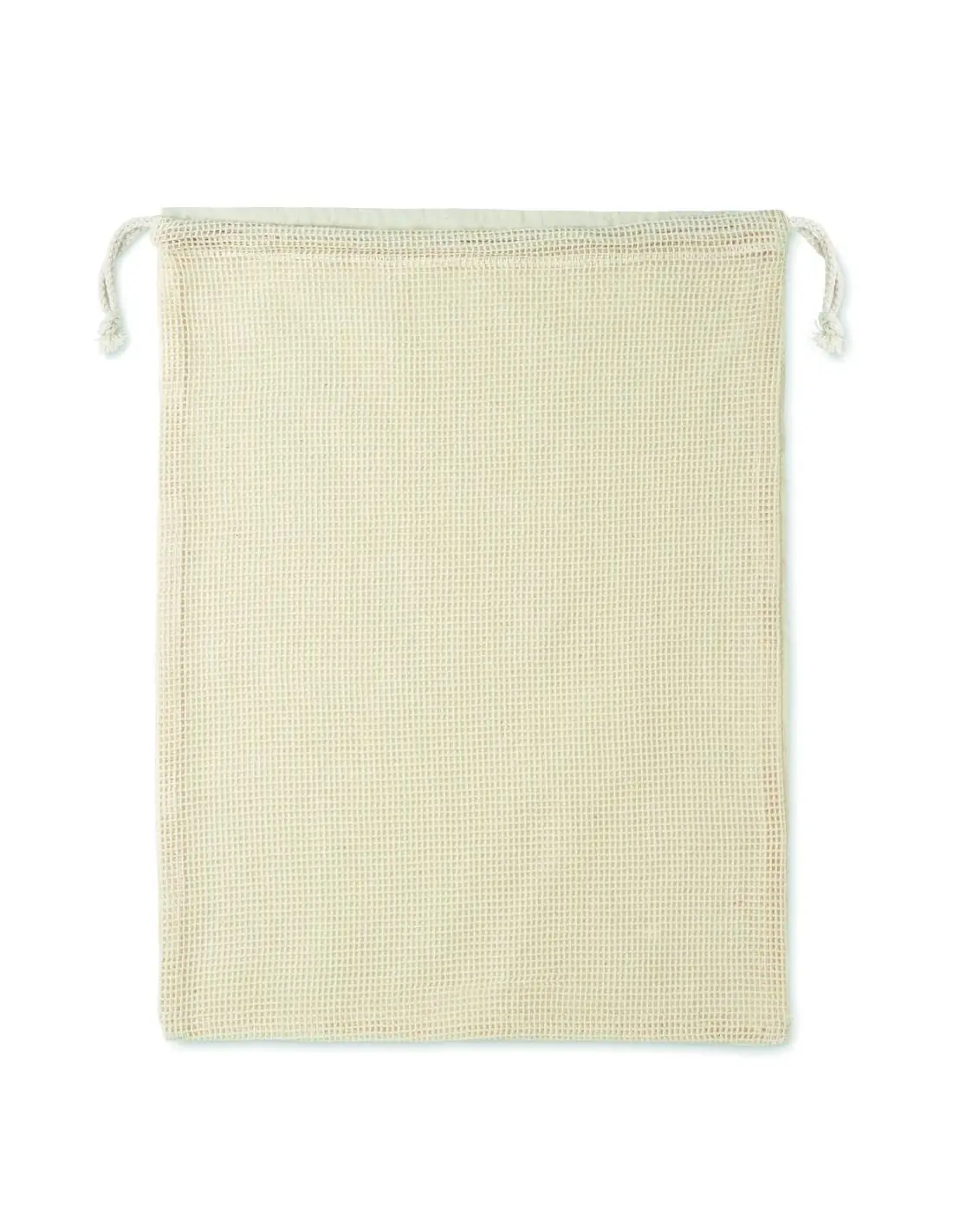 Bolsa rejilla para comida de algodón (140gr/m²) por un lado, y de rejilla de algodón (110gr/m²) y cuerda en la parte superior para el cierre de la bolsa.