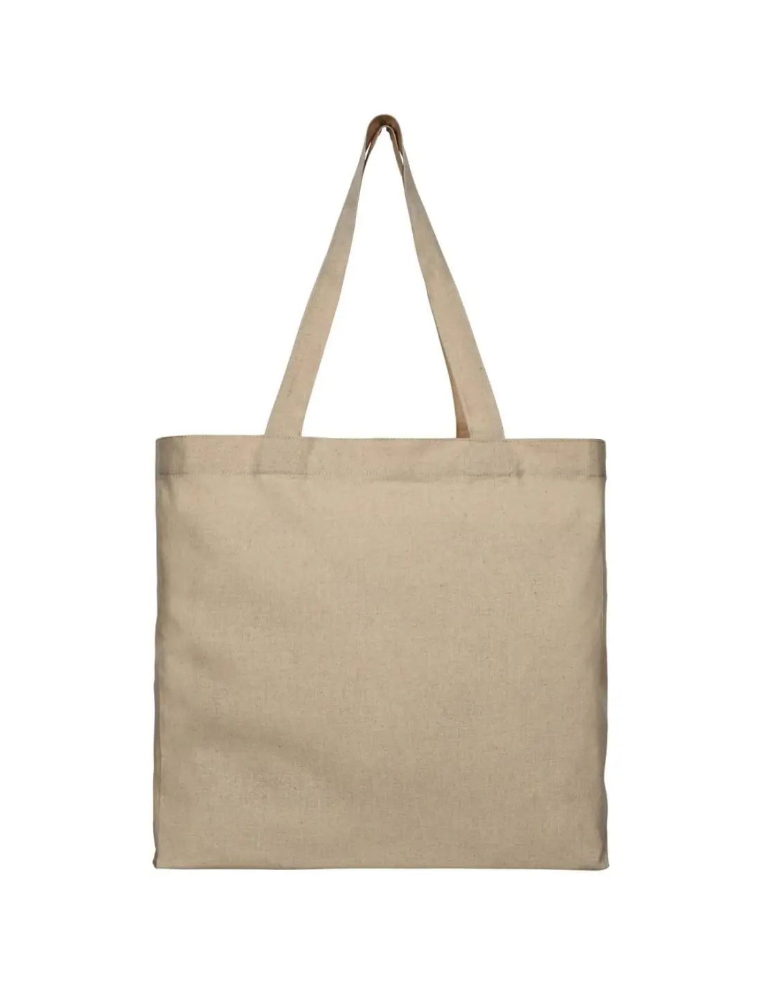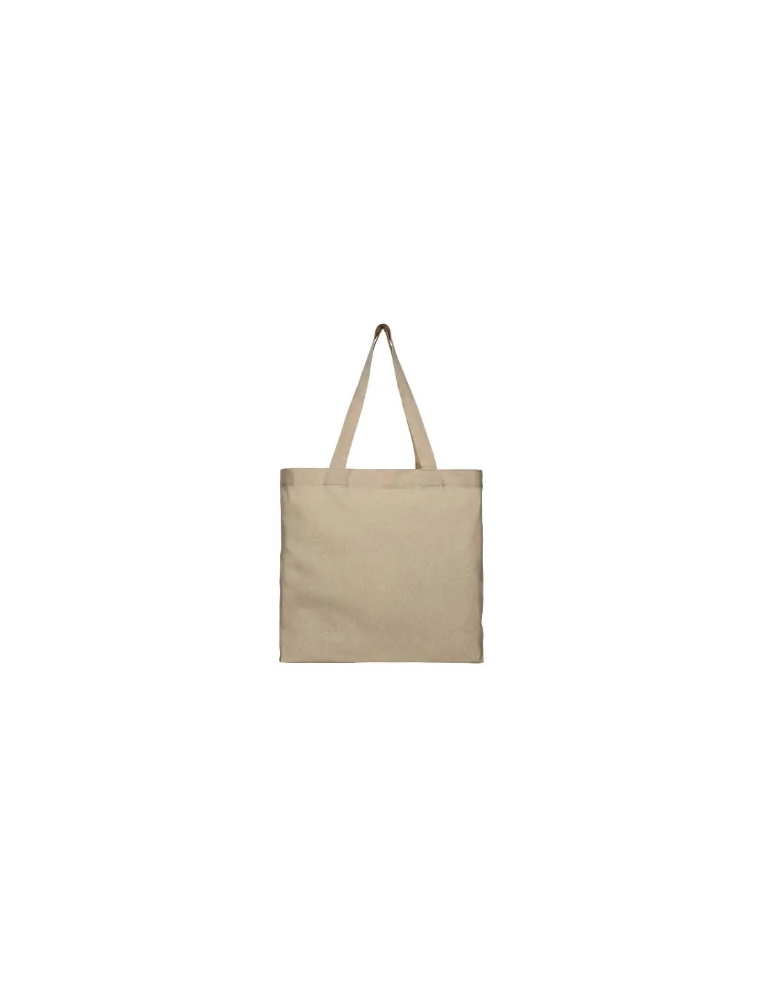 Bolsa tote confeccionada en mezcla de algodón poliéster reciclado de 210 g / m². El algodón reciclado se fabrica a partir de los residuos preconsumo generados por las fábricas textiles durante el proceso de corte. Con refuerzos y un compartimento principal grande. Dispone de dos asas con una longitud de hasta 31 cm. Resistente hasta 10 kg de peso. Puede haber pequeñas variaciones en el color del producto real debido a la naturaleza del proceso de producción.