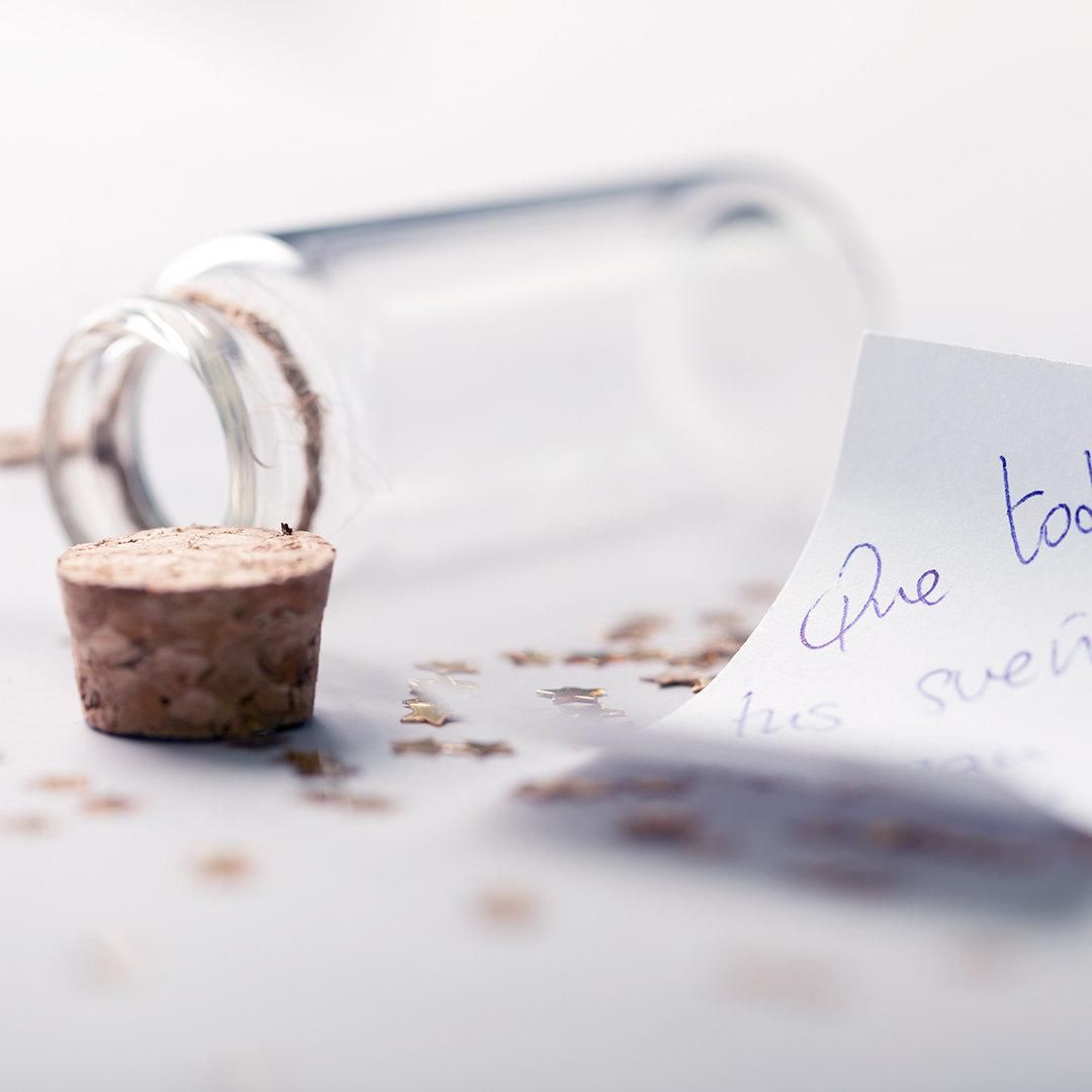 Botecito para guardar tus mejores deseos de esta navidad. Incluye pergamino de papel y bote en cristal. Con tapón y lacito para colgar, presentado en cajita blanca individual