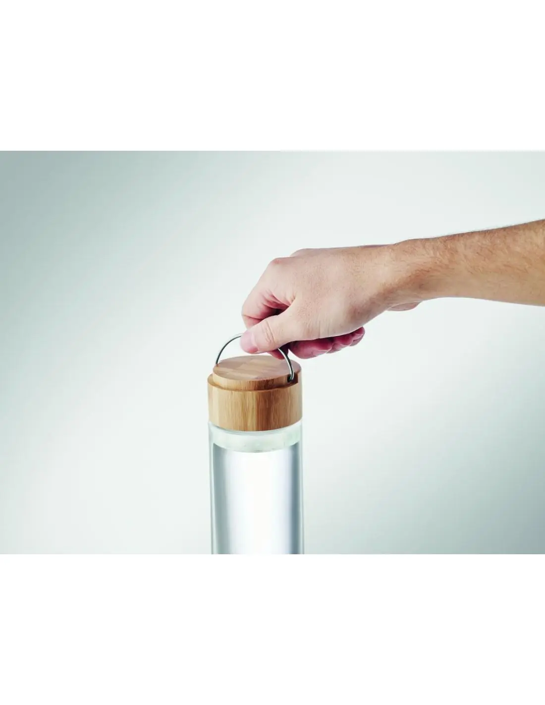 Botella de cristal con tapa de bambú con asa. Capacidad: 500 ml. Anti fugas. El bambú es material natural, el color del articulo puede variar.