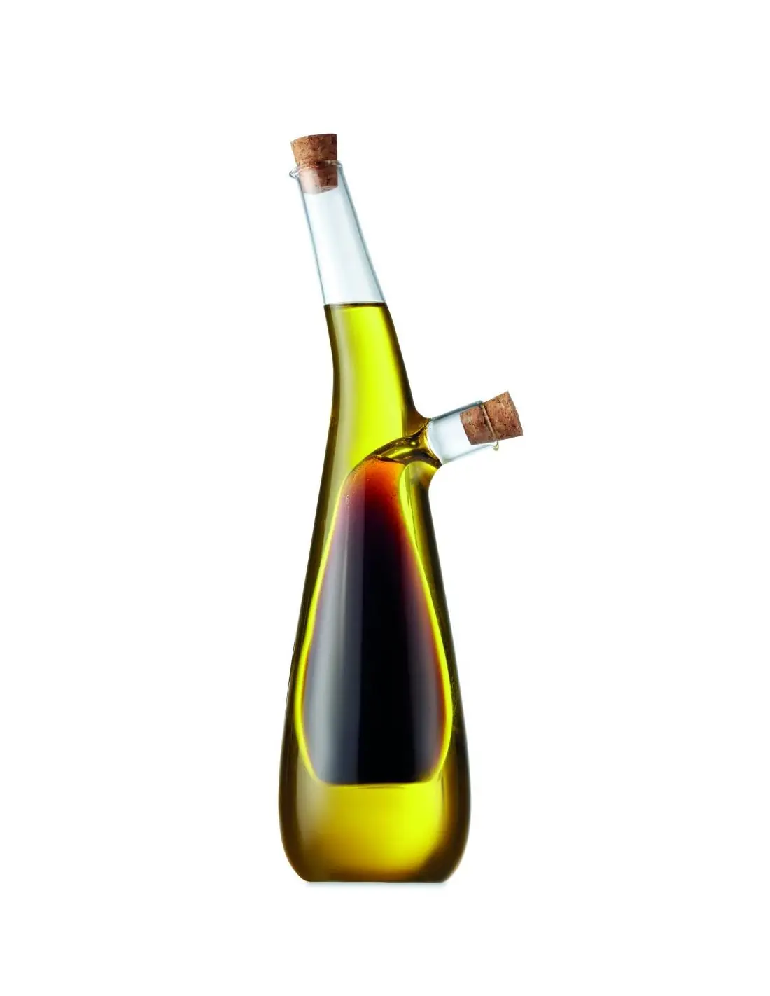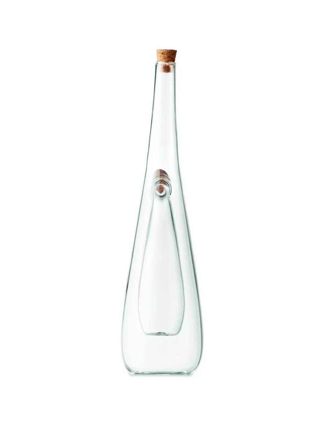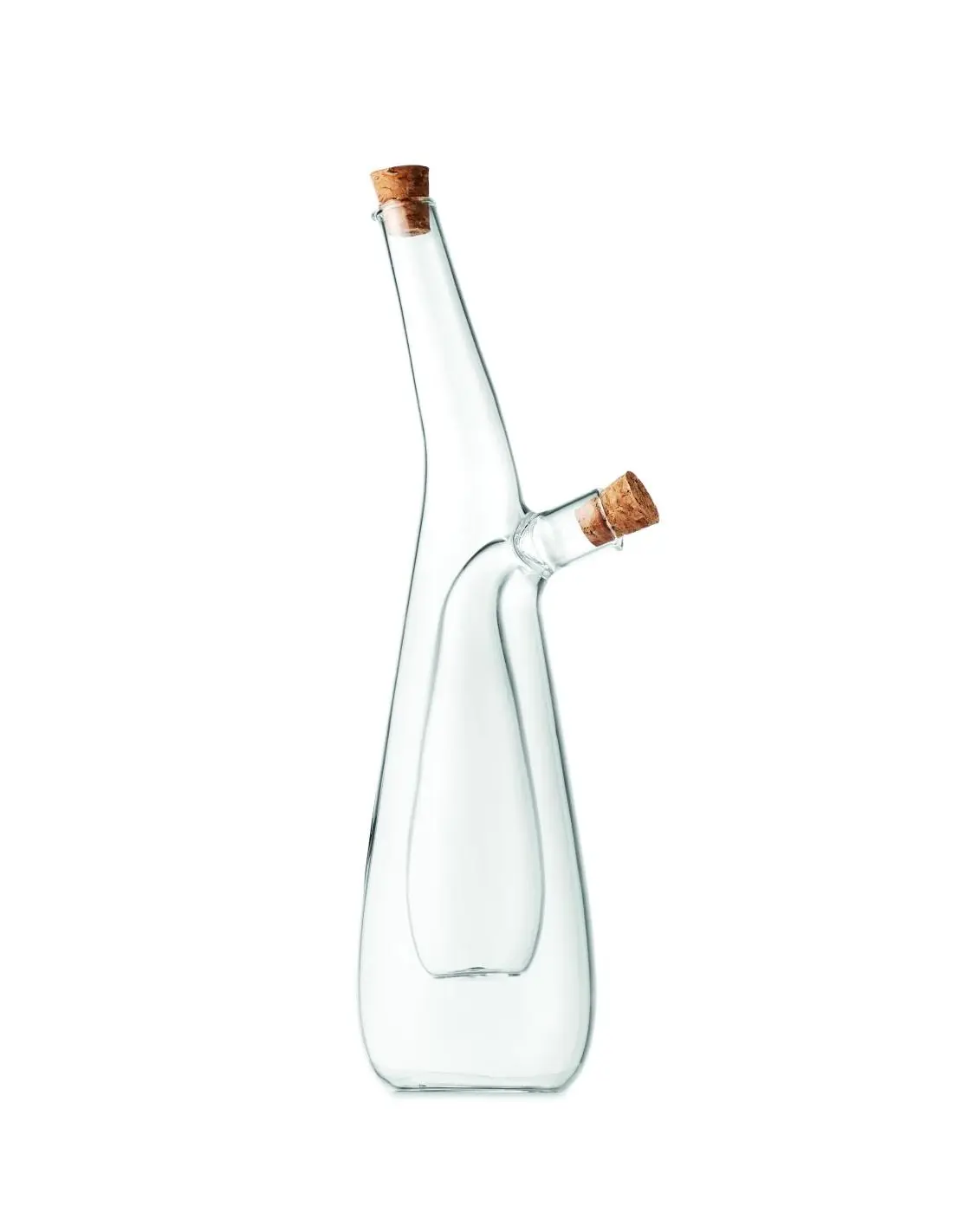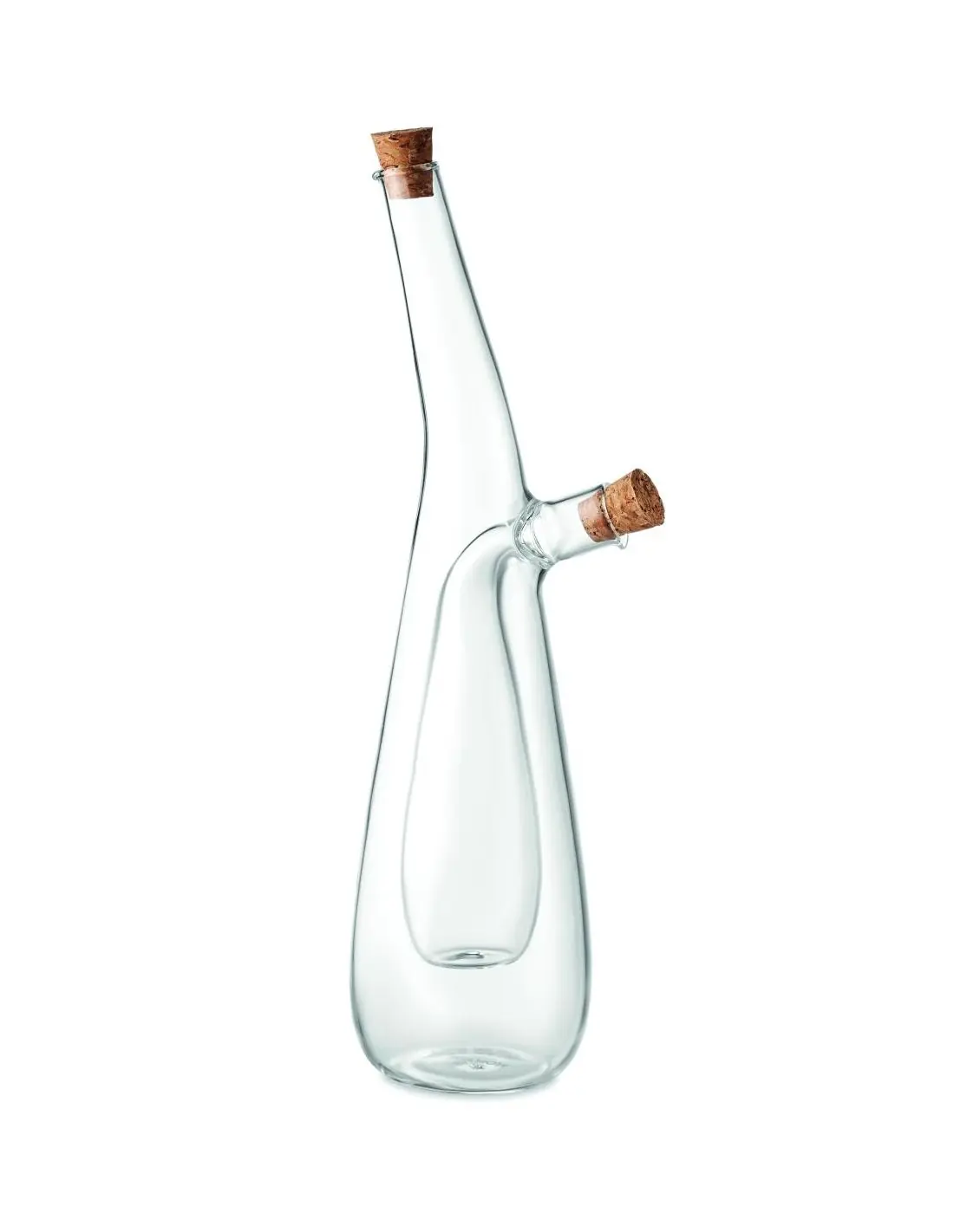 Aceitera y vinagrera de cristal de borosilicato con tapones de corcho. Capacidad exterior: 300 ml. Capacidad interior: 80 ml. El corcho es un material natural, debido a su naturaleza estructural y porosidad superficial, el resultado final de la impresión por artículo puede tener desviaciones.