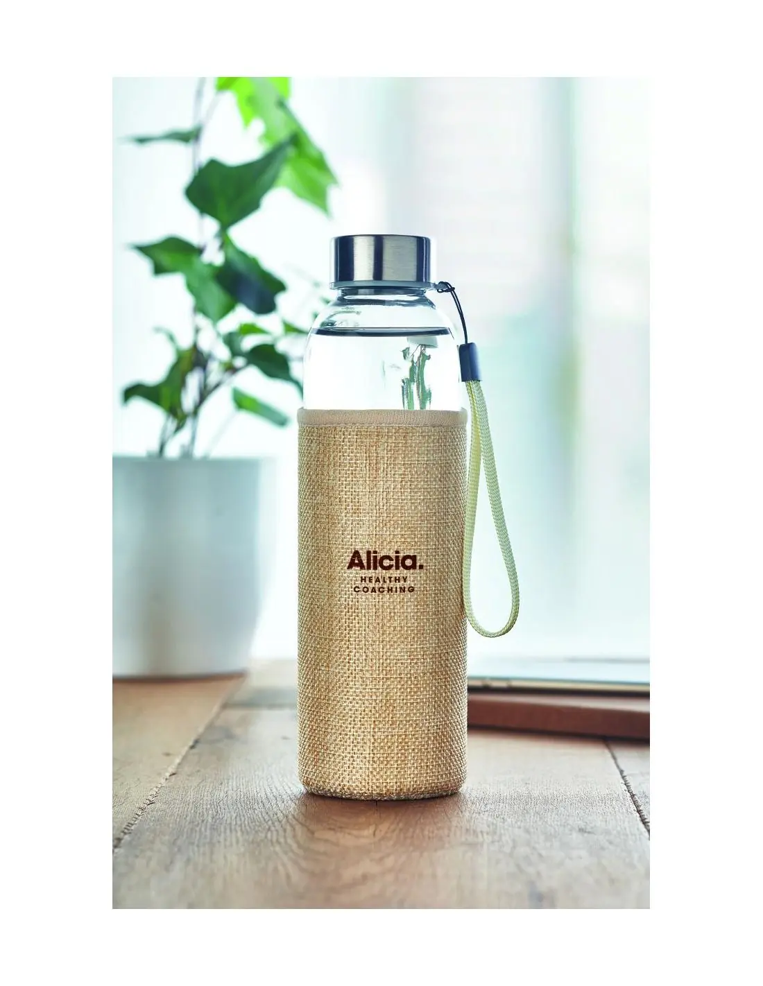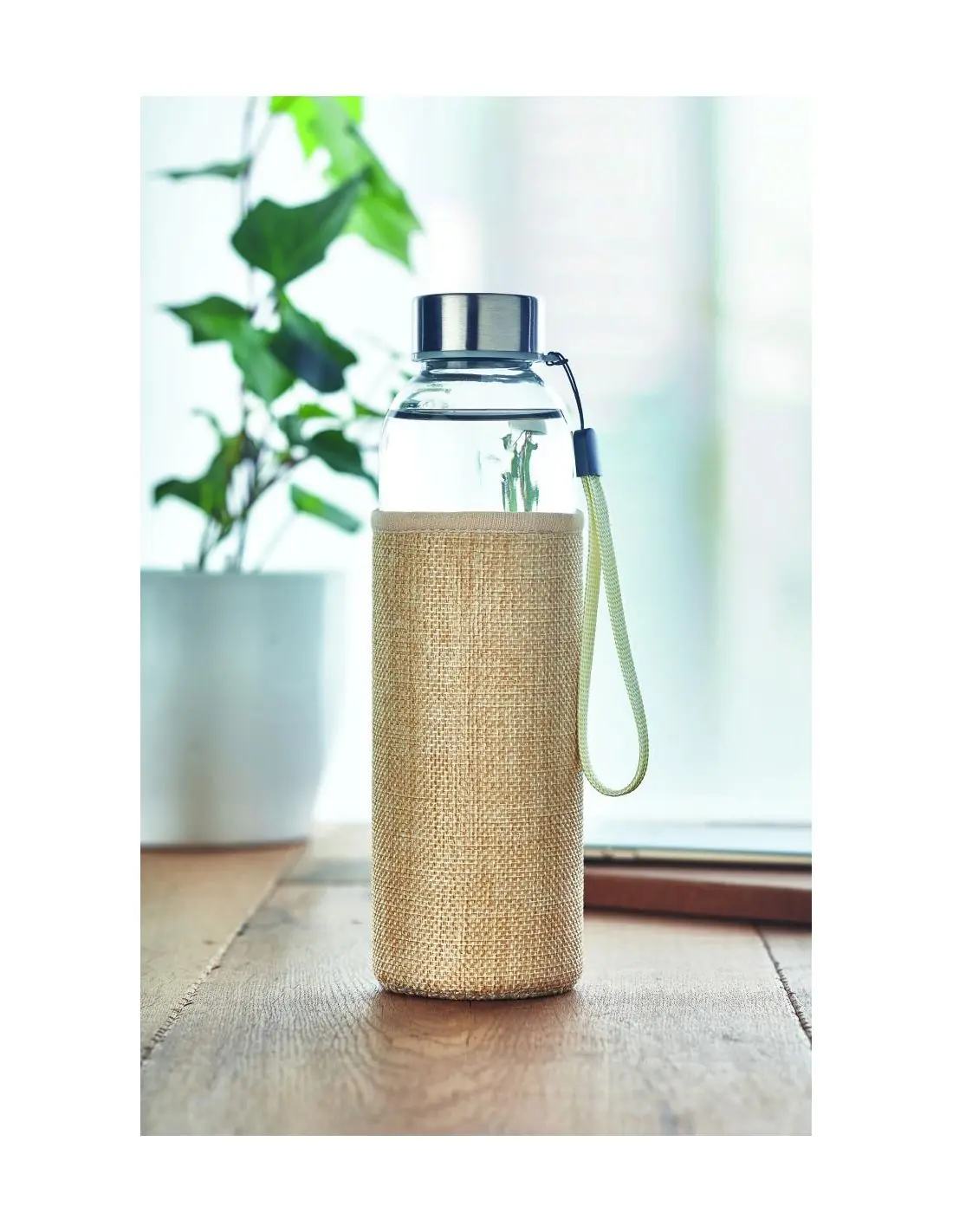 Botella de cristal con funda de neopreno y yute. Capacidad: 500 ml. No apto para bebidas gaseosas. Anti fugas.