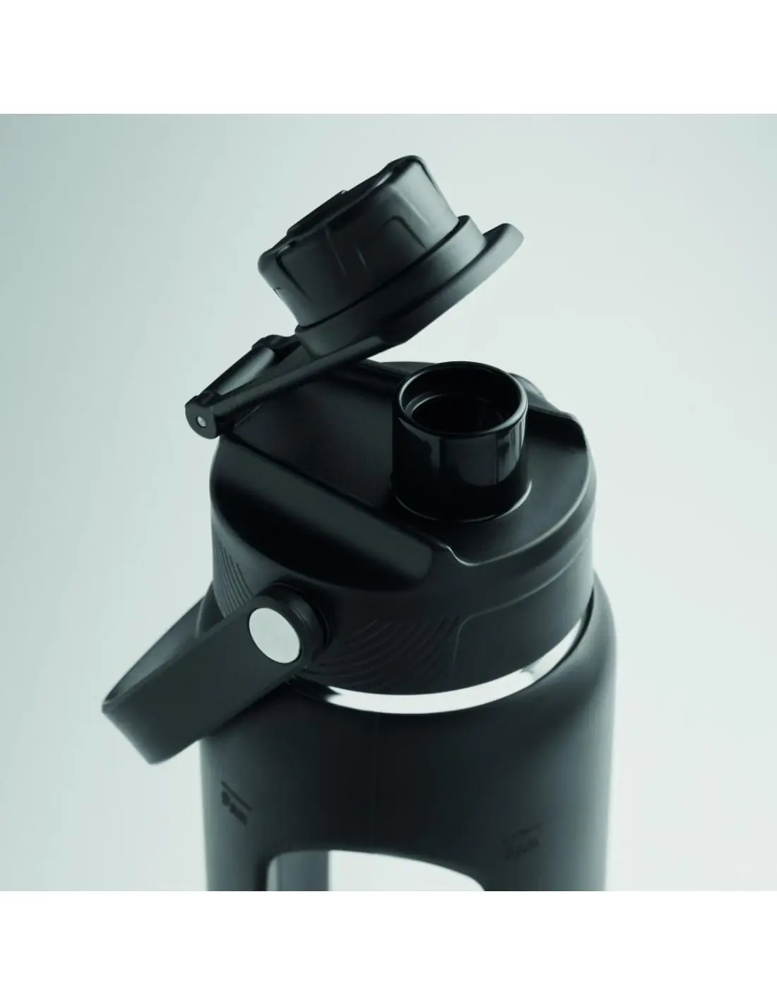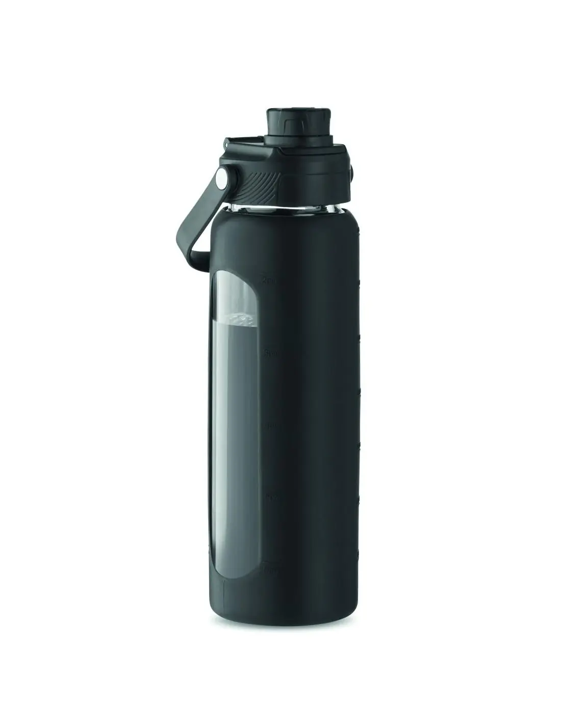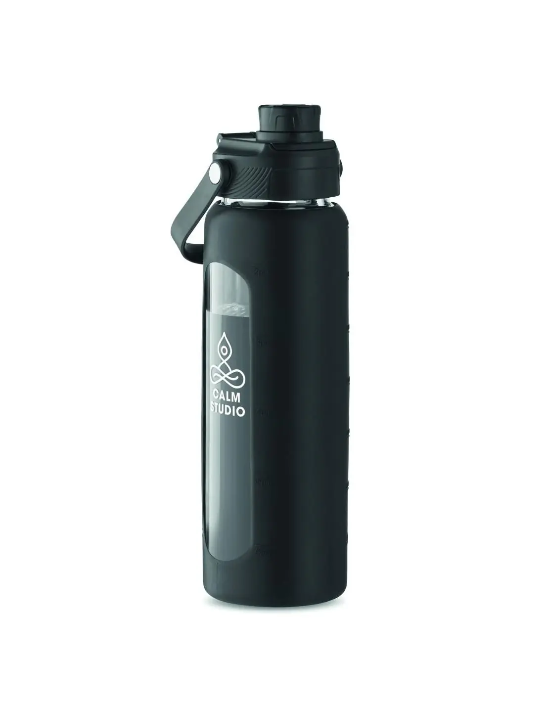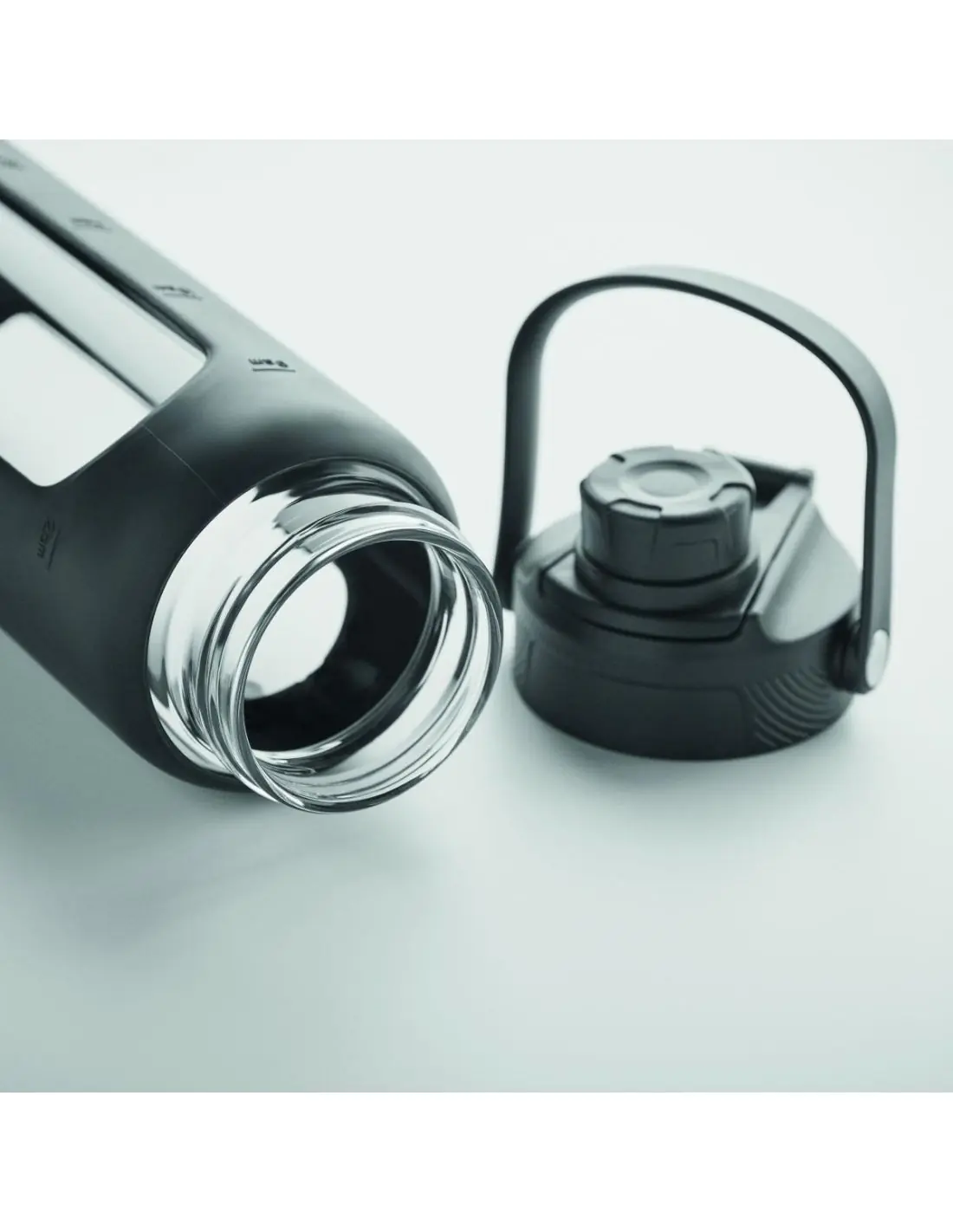 Botella de vidrio de borosilicato con funda transparente de silicona y tapa de PP con asa de transporte. Anti fugas. Capacidad: 750 ml.