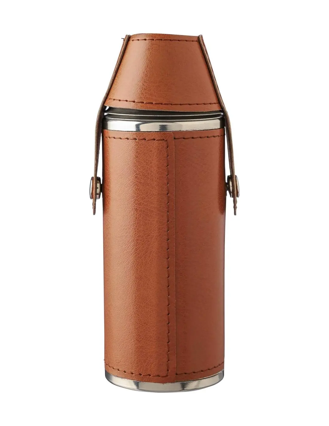 Botella de acero inoxidable reciclado 304 (230 ml) con dos vasos en la parte superior (40 ml) que se extraen con botones a presión, y funda de PU en el exterior. Presentada en una caja de cartón marrón.