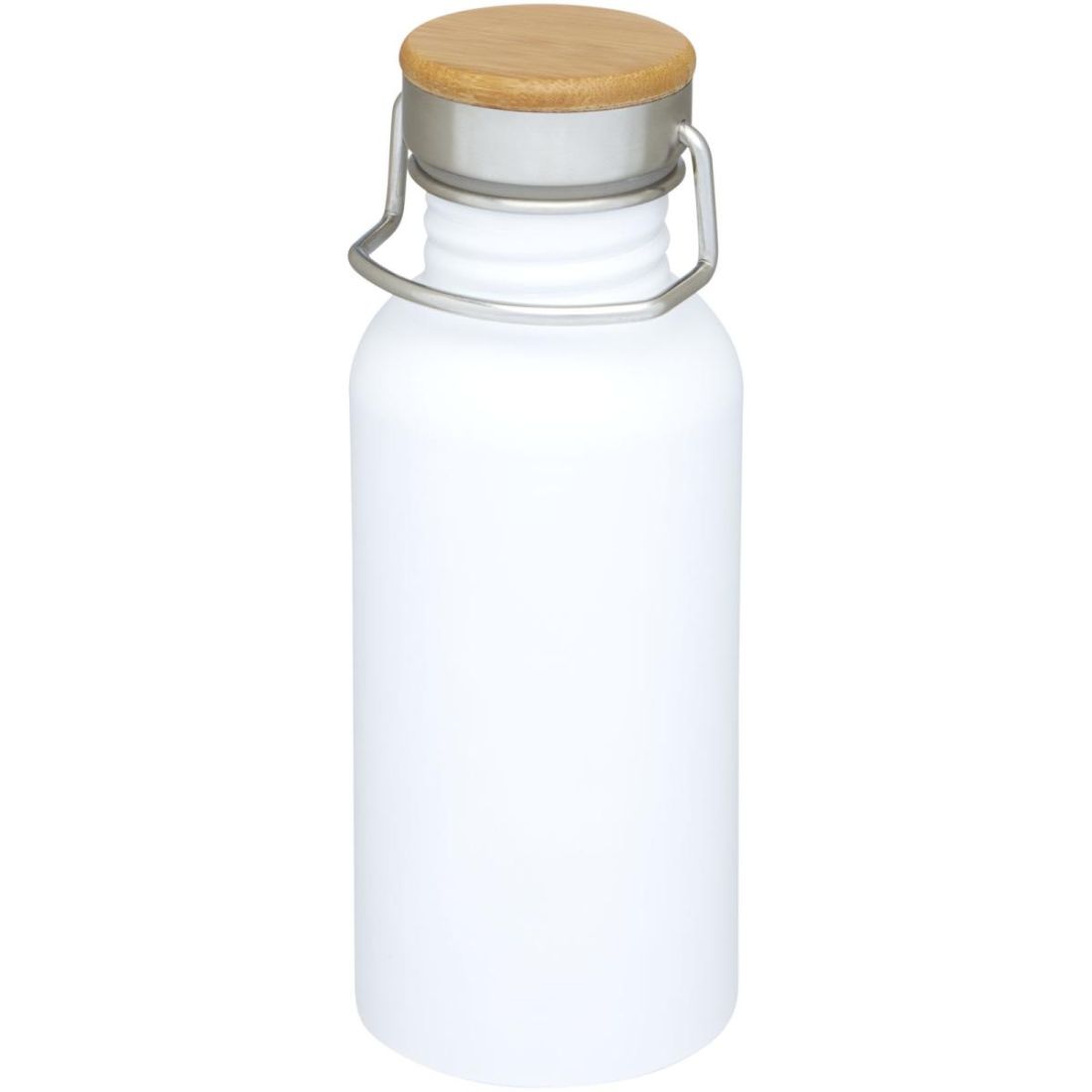 Botella de acero inoxidable de una sola pared con tapa de rosca. La parte superior de la tapa es de bambú, y lleva un asa para facilitar el transporte. Capacidad de 550 ml. Se presenta en una caja de regalo .