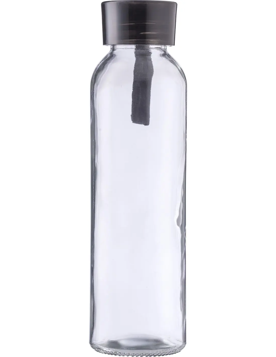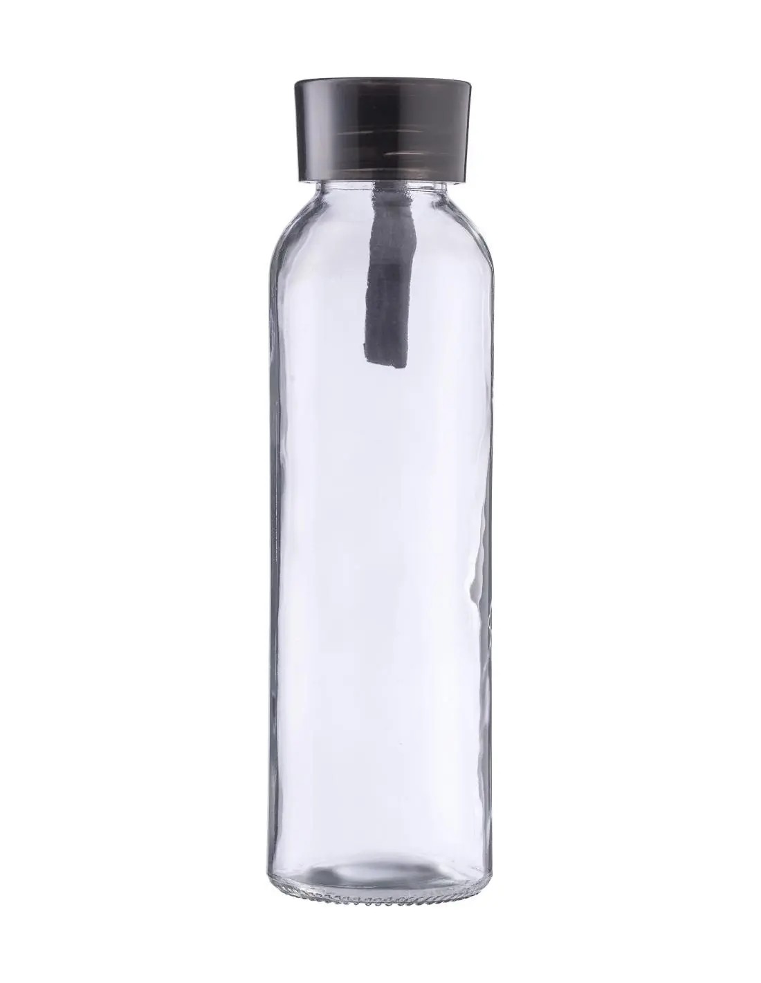 Botella de cristal (500 ml) con tapón de PS y correa de silicona a juego. Presentada en una caja de cartón marrón. Recomendable para uso de agua fría. Evitar bebidas ácidas o con gas.
