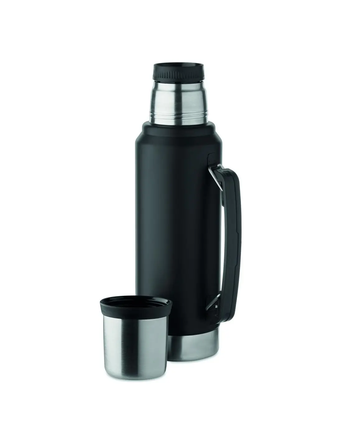 Botella de doble pared con aislante al vacío de acero inoxidable reciclado (90% de acero inoxidable reciclado y 10% de acero inoxidable) con asa lateral. Con tapa de PP y vaso de acero inoxidable reciclado. Anti fugas. Capacidad: 1L.
