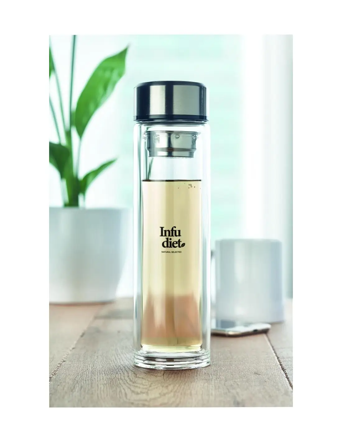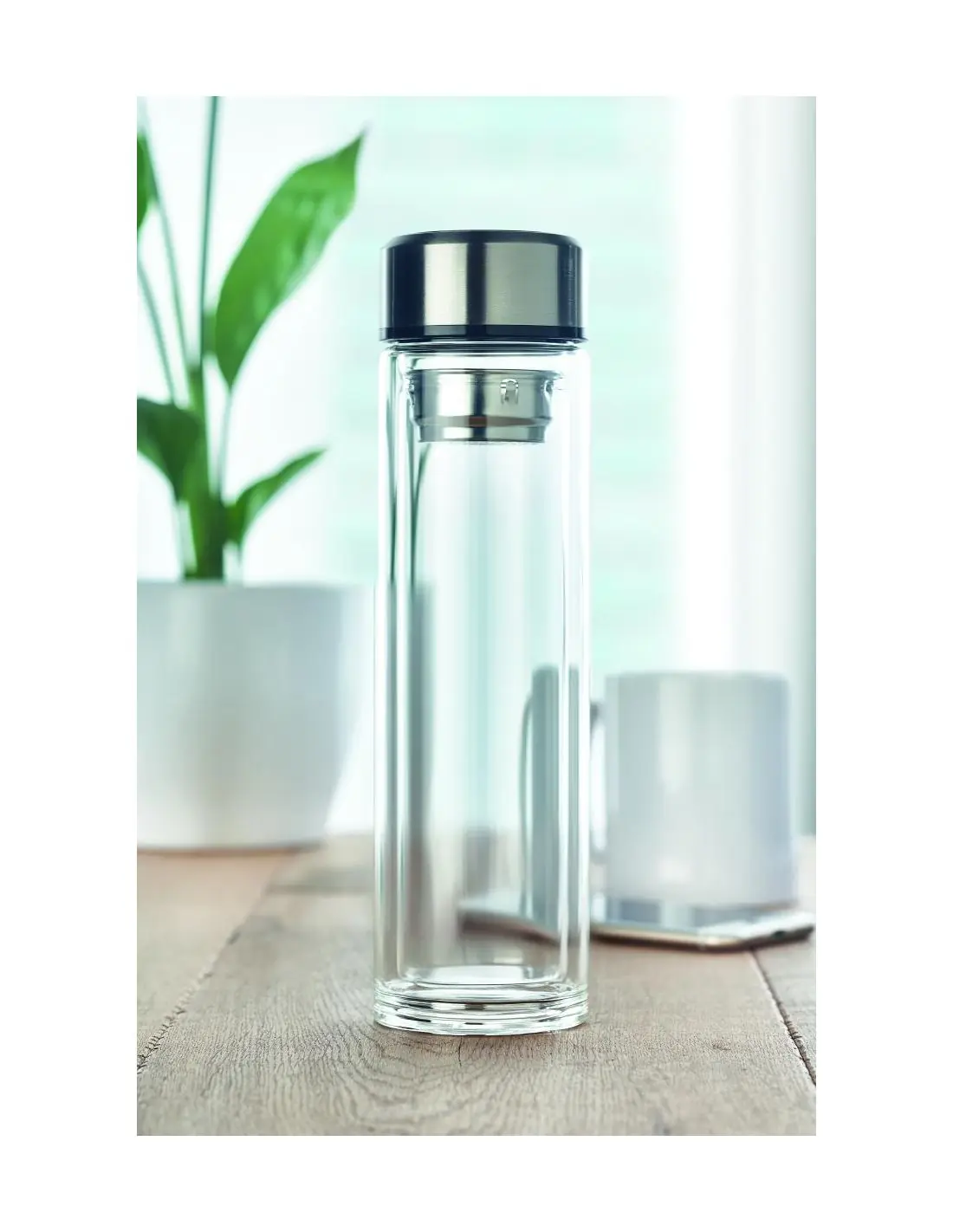 Botella de cristal (vidrio de borosilicato) de doble pared. con infusor de té y termómetro táctil LED en la tapa. Anti-fugas. Incluye 1 pila CR2032 reemplazable. Capacidad: 390 ml. Anti fugas.