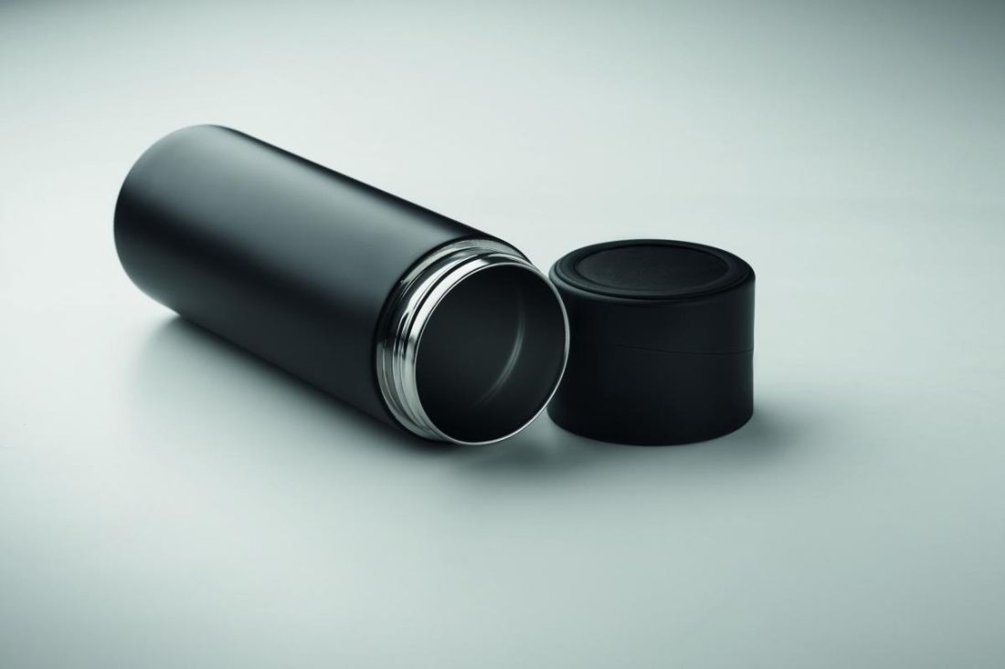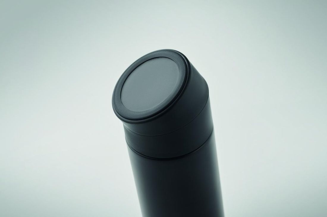 Botella de doble pared aislada al vacío de acero inoxidable reciclado (90% de acero inoxidable reciclado y 10% de acero inoxidable) con tapa de silicona antideslizante con anillo portateléfono. Capacidad: 420 ml.