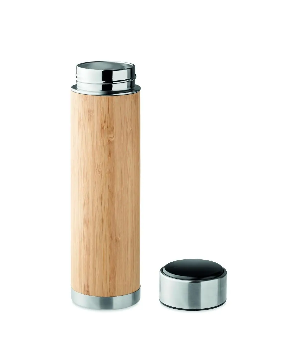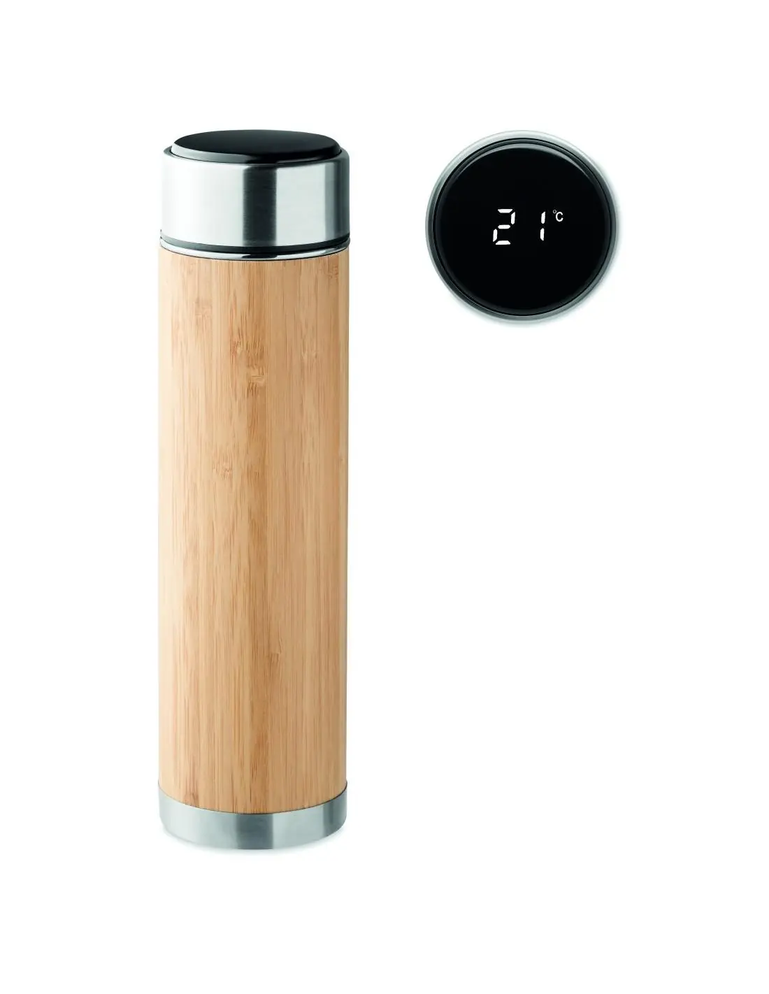 Botella de bambú con acero inoxidable de doble pared aislado al vacío con infusor de té en su interior. Incluye termómetro táctil LED en la tapa. I…