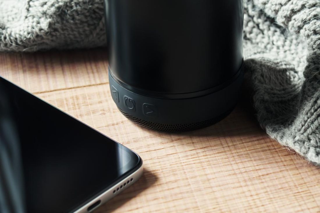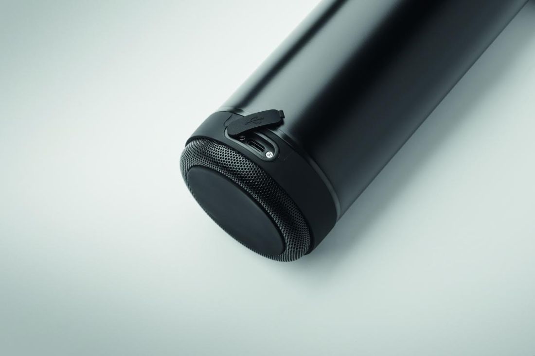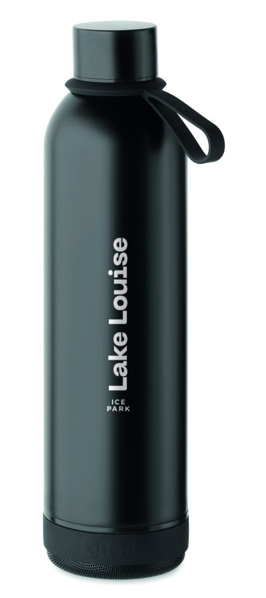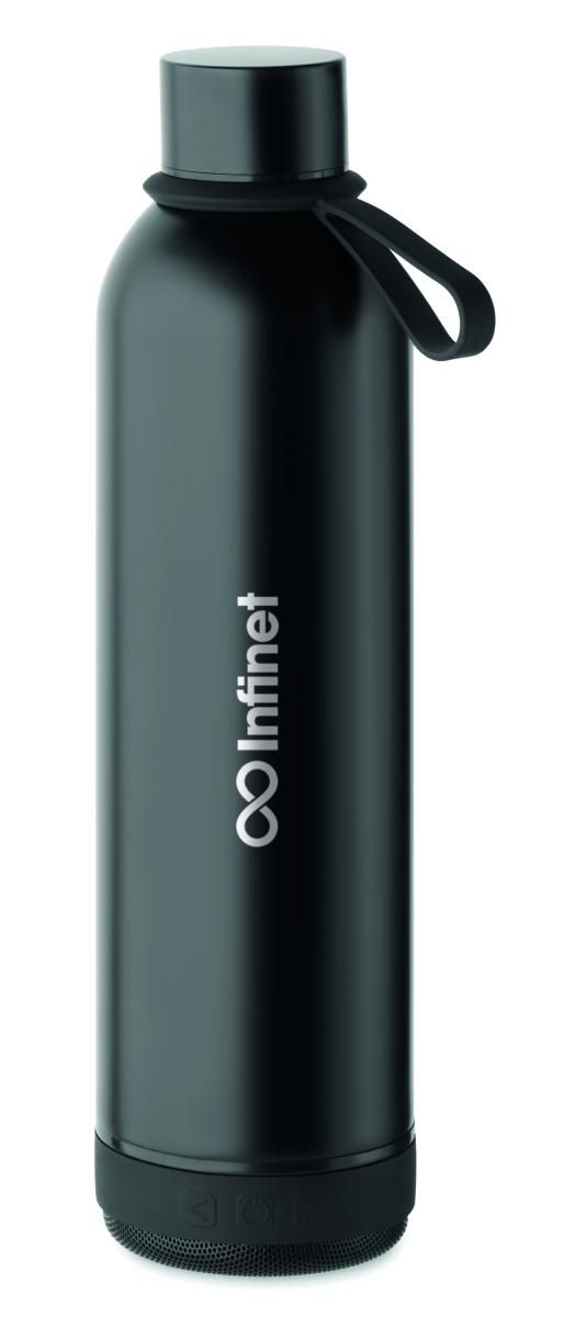 Botella doble pared aislada al vacío de acero inoxidable reciclado (90% acero inox reciclado y 10% acero inox) y asa de transporte de silicona con altavoz inalámbrico 3 W. Capacidad: 500 ml. Batería 500 mAh. Desmontar el altavoz para limpiarlo. Antifugas.