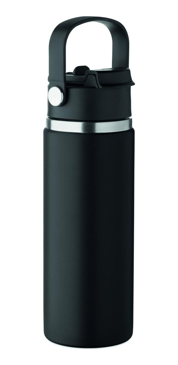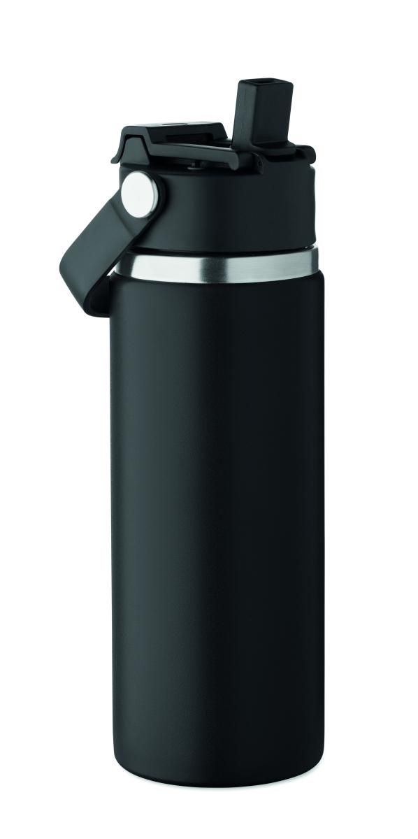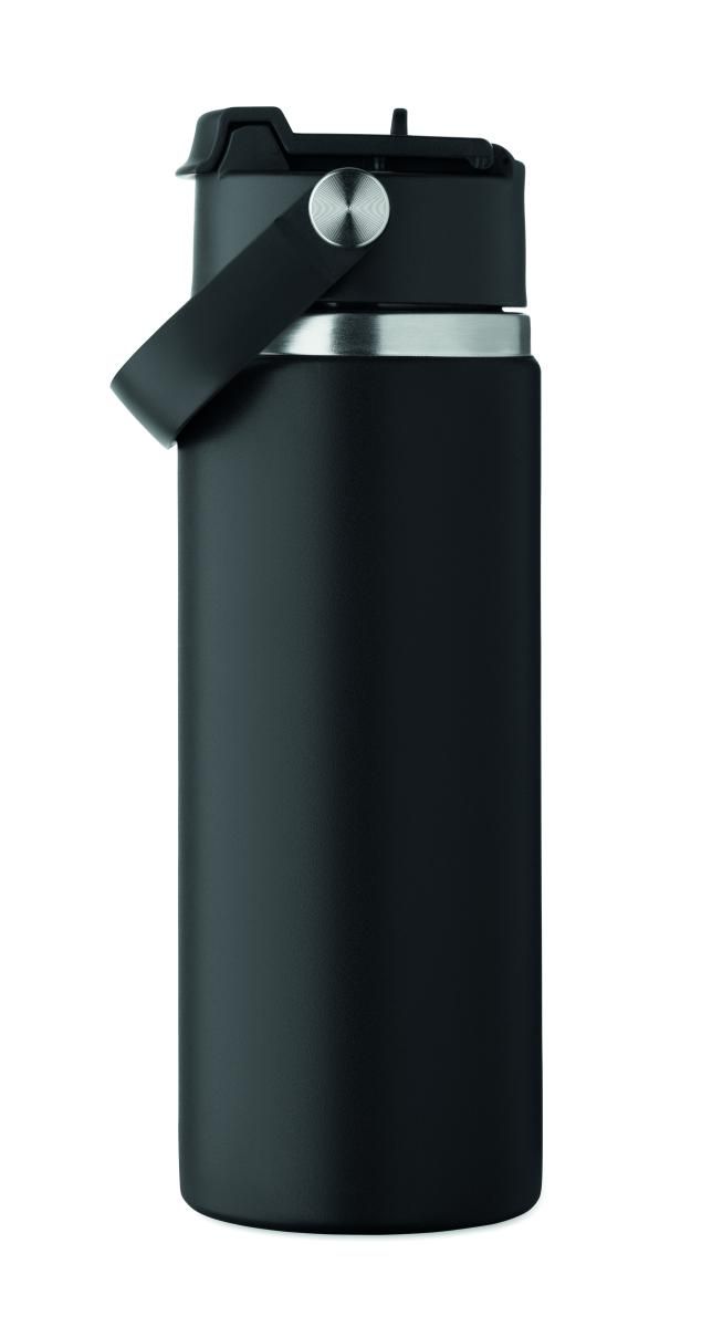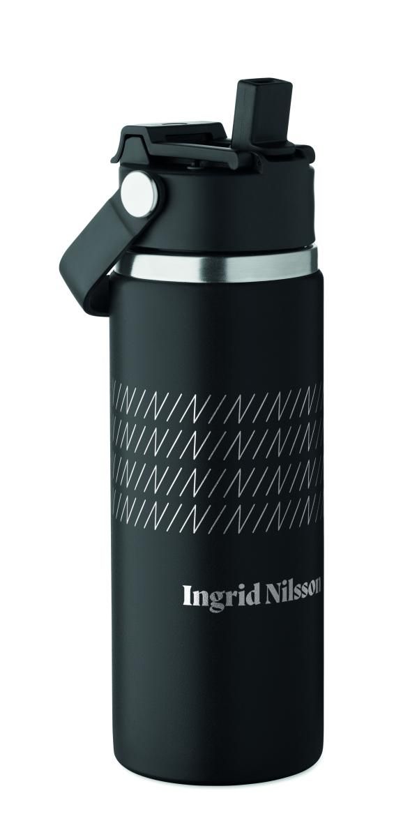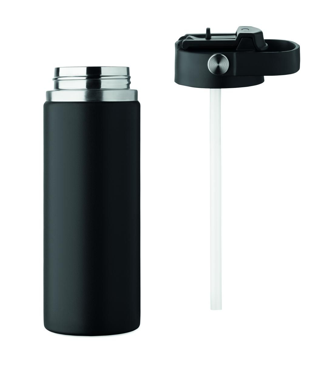 Botella de doble pared de acero inoxidable reciclado (90% de acero inoxidable reciclado y 10% de acero inoxidable) con pajita combinada y tapa para sorber con asa. Anti fugas. Capacidad: 500 ml.