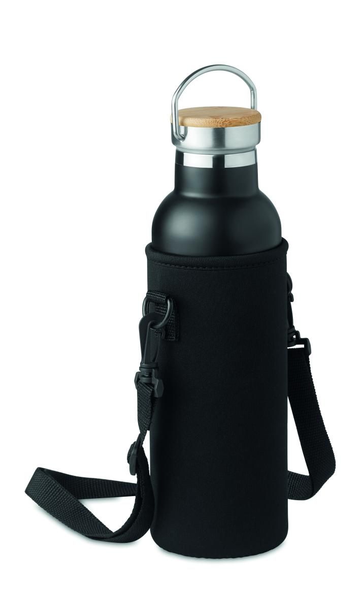Botella de acero inoxidable de doble pared aislado al vacío con tapón de rosca anti fugas acabado de madera y tapón adicional con boquilla intercambiable. Se suministra con bolsa de transporte de neopreno. Capacidad: 700 ml.