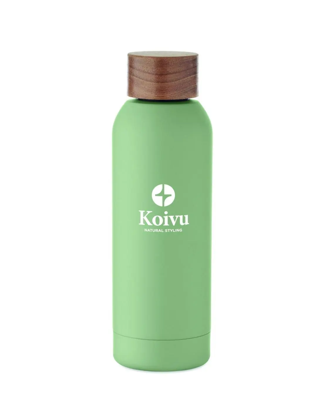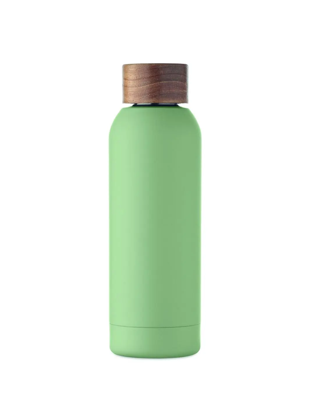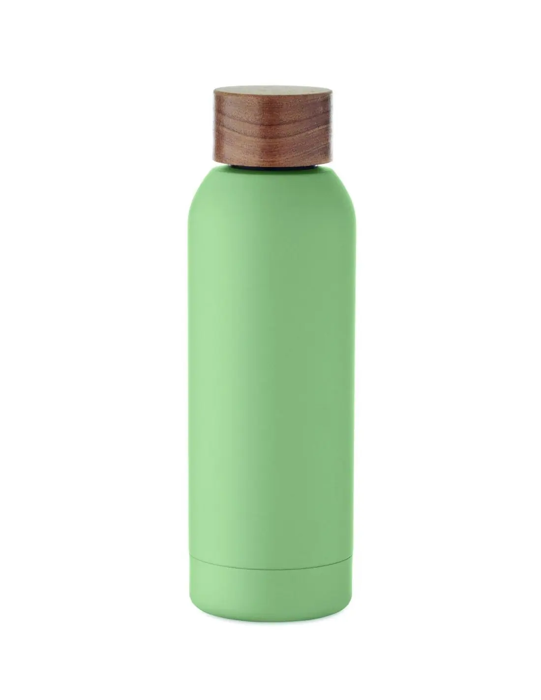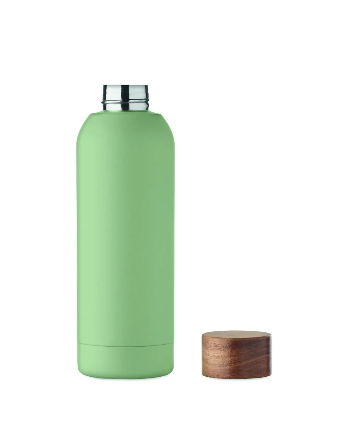 Botella de pared simple de acero inoxidable reciclado al 90% y acero inoxidable al 10% con acabado de caucho y tapa de madera de acacia. Anti fugas…