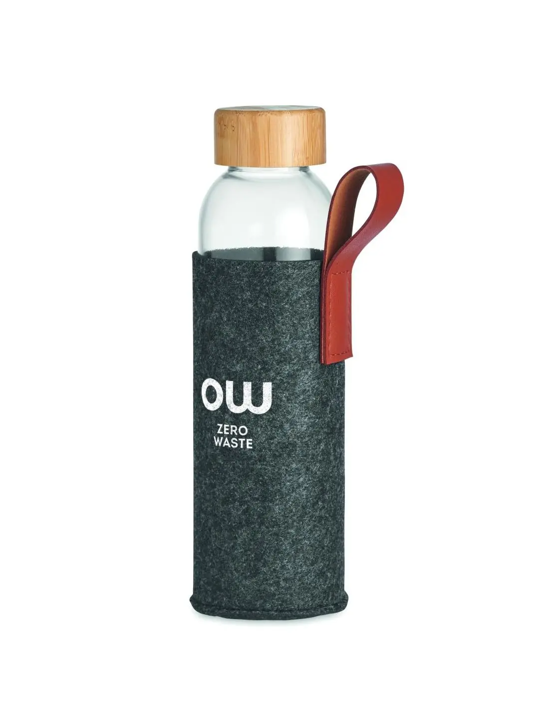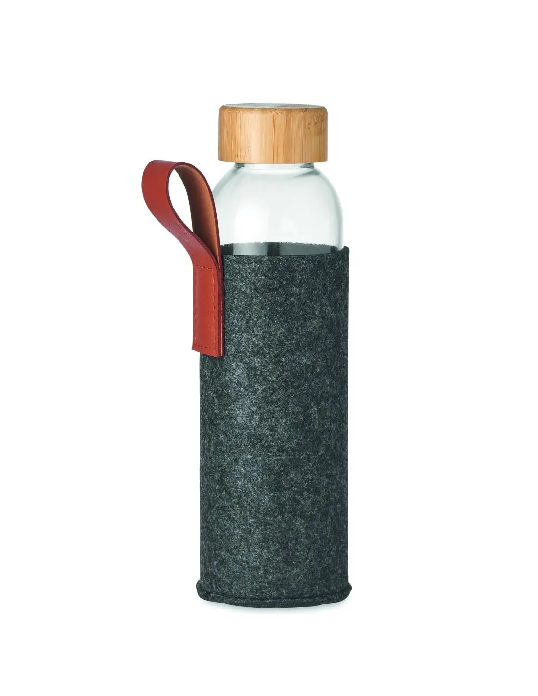 Botella de vidrio con tapa de bambú con asa de PU y bolsa de fieltro RPETRPET. Capacidad: 500 ml. El bambú es material natural, el color del articulo puede variar.