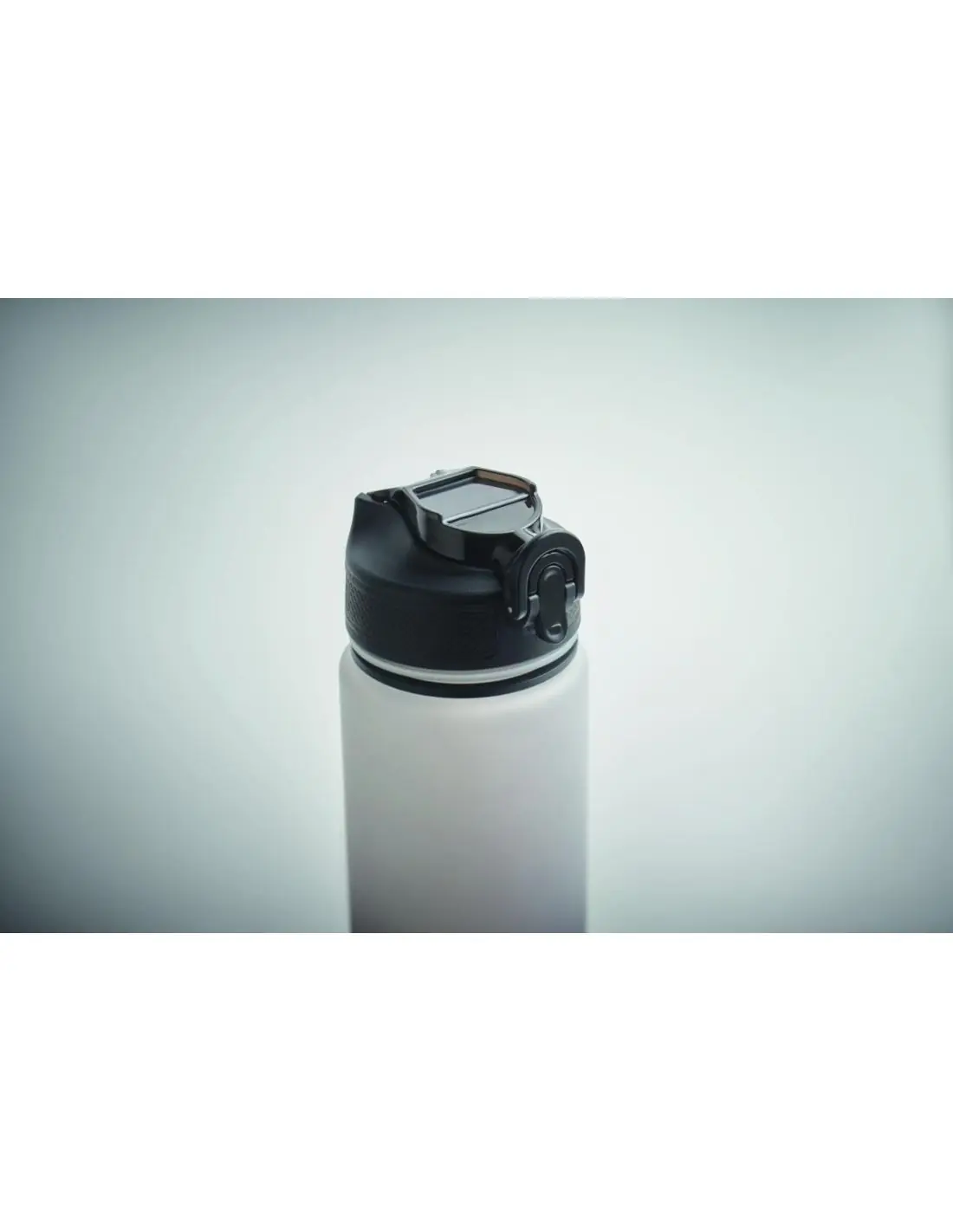 Botella de agua deportiva en RPET con pajita integrada, boquilla de silicona suave, marcador de tiempo motivador, tapa abatible que se abre con una mano, cierre de seguridad y correa de transporte. Capacidad 1L.