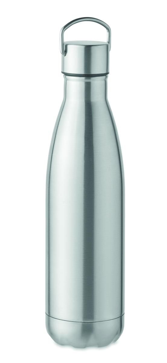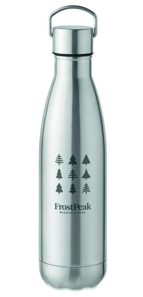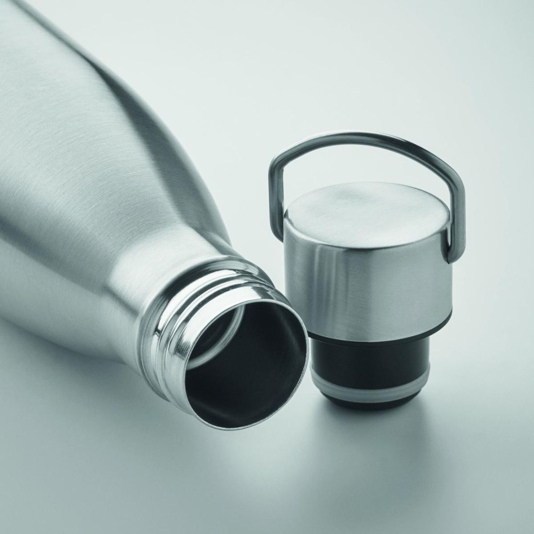 Botella de acero inoxidable reciclado de doble pared (90% de acero inoxidable reciclado y 10% de acero inoxidable) con aislamiento térmico y tapa con asa. Anti fugas. Capacidad: 500 ml.